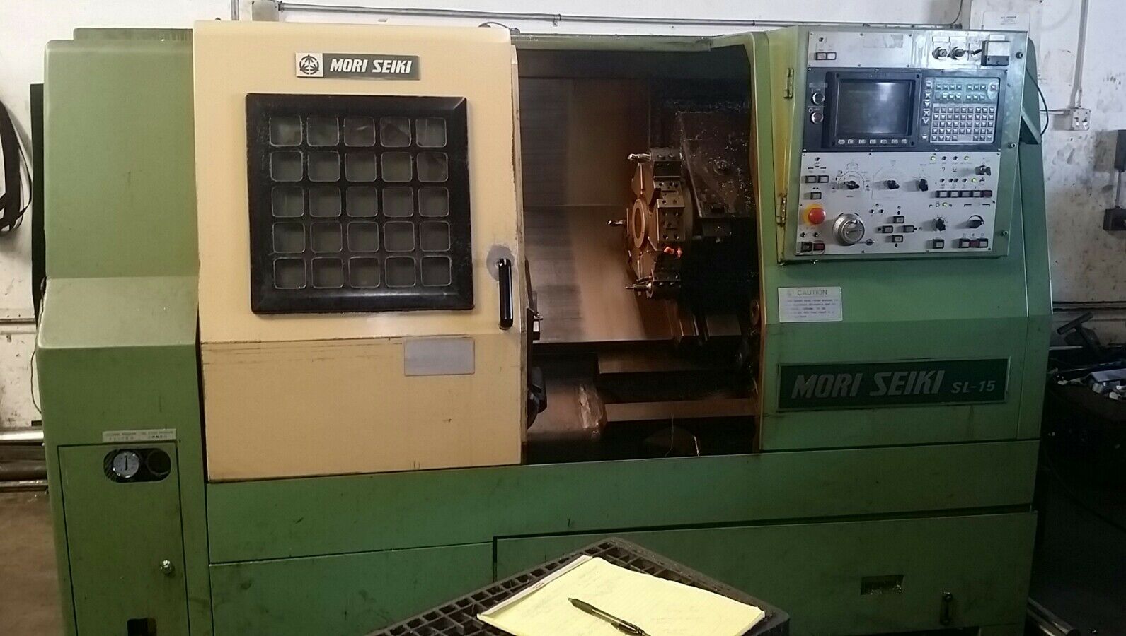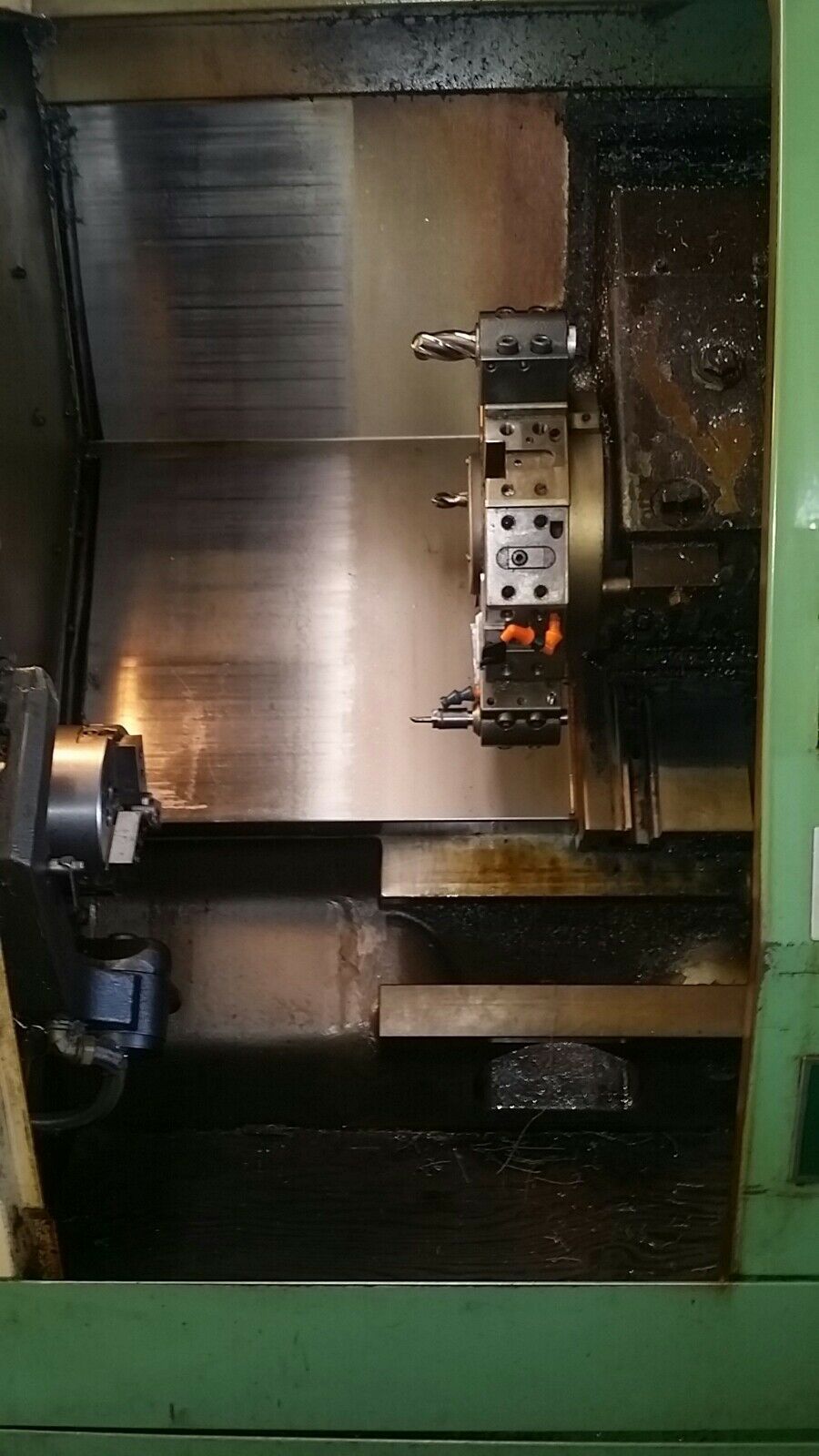 What is the wood block inside the machine for? to catch parts when we part off, remove wood when no part off operation.