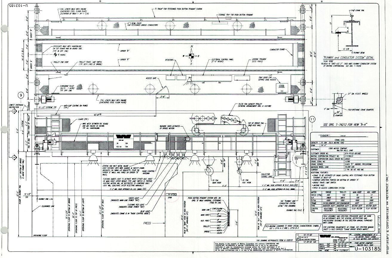 70 TON X 74'9" WHITING 8 WHEEL OVERHEAD BRIDGE CRANE WITH 35 TON AUXILIARY: STOCK 13211