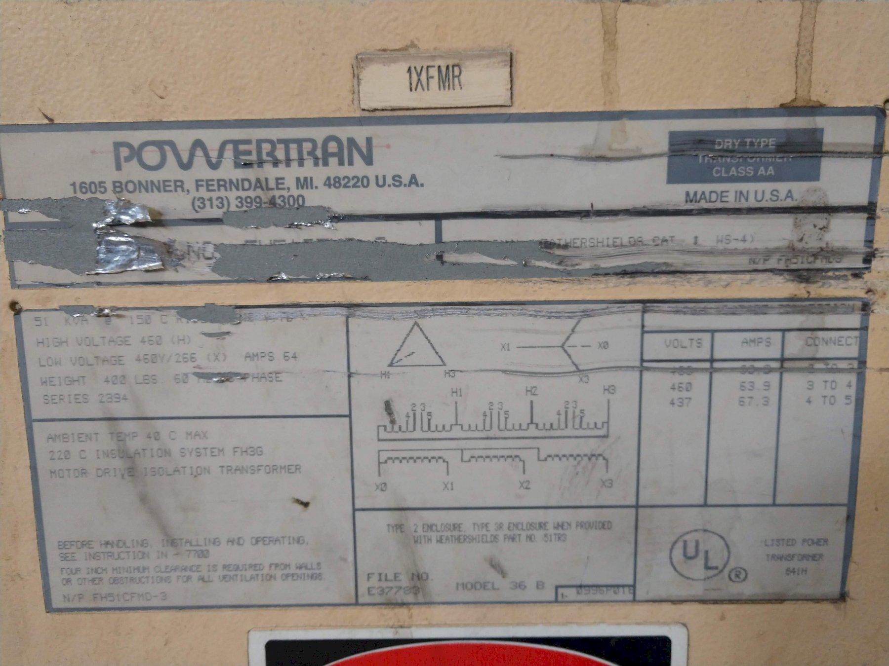 51 KVA POWERTRAN 460 TO 460Y/266 VOLT ELECTRIC TRANSFORMER: STOCK #10822