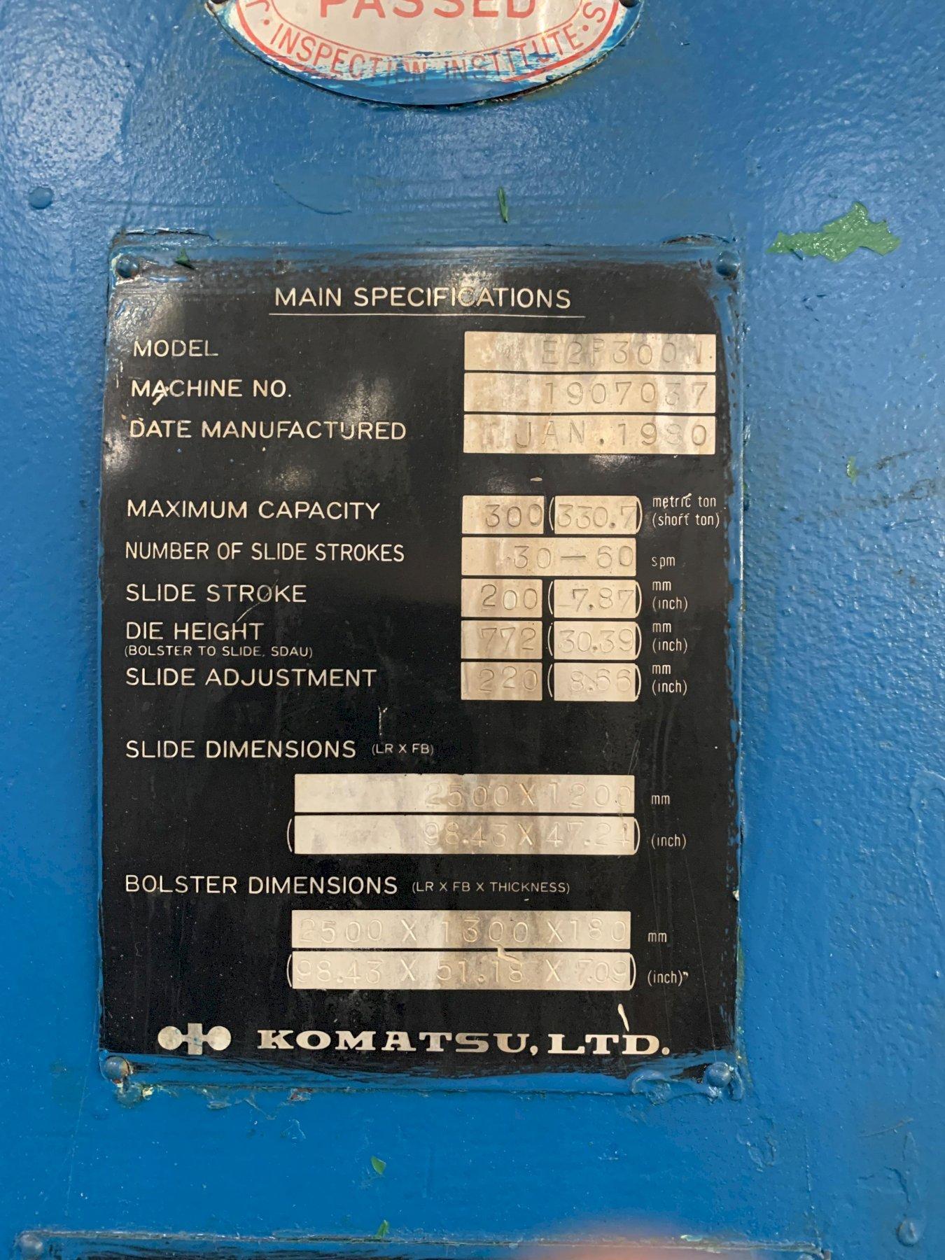 Upgrade your metal stamping operations with this exceptional Used 300 Ton Press For Sale, a durable Komatsu E2P-300 Komatsu Straight Side Press. This 300 Ton Komatsu press delivers 300 metric tons (330 US short tons) of precision force, making it ideal for demanding industrial applications. This used mechanical metal stamping press is a testament to Komatsu's engineering excellence, featuring a sturdy fabricated frame and slide. The updated Cieco controls ensure modern operational efficiency, while the hydraulic overloads and precision lubrication system guarantee reliable performance.