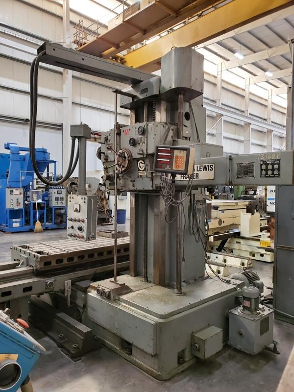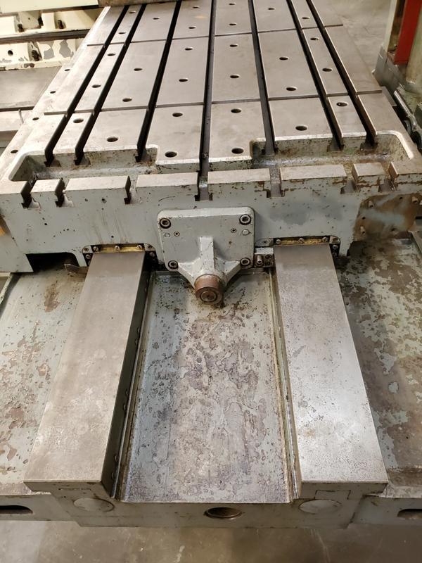 4" GIDDINGS & LEWIS TABLE TYPE HORIZONTAL BORING MILL PRICE: Loaded on Truck, Our Warehouse, York, PA …… $32,500.00 Stock # 13168-P Serial # 150-917 New 1969 Model # 70A-DP4-T Fraser Table Size: 36" x 74" with (7) 13/16" Tee Slots & (3) 3/4" Key Slots Table Travel: Approx. 72" Saddle Travel: Approx. 60" Head Vertical Travel: 55" Spindle Travel: 28" Spindle Speeds: 10 to 1300 RPM Spindle Taper: #50 with Power Draw Bolt Spindle Feeds: .002 to .250 TPR Milling Feeds: .040 to 120 IPM Pendant Control (2) Floor Mounted Table Outrigger Supports: 111" L x 14" W x 8-1/2" H Hard Bed & Table Ways Soft Vertical Ways 20 HP Main Motor, 3 Phase, 50 Cycle, 440 Volts 1-1/2 HP Hydraulic Pump Motor, 3 Phase, 50 Cycle, 440 Volts Overall Machine Size: 200" Long x 88" Wide (Table & Saddle Removed) 127" Wide (Fully Assembled) x 128" High Electrical Cabinet: 44" Long x 15" Wide x 75" High Total Machine Weight: 23,500 Lbs.