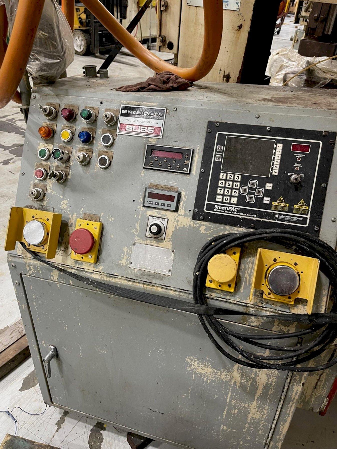This used 300-ton Bliss SC2-300-60-42 straight side mechanical stamping press is undergoing a comprehensive mechanical, air, and lubrication reconditioning. It features a 10" stroke, 27" shut height (with 10" motorized adjustment), and a 60"x42" bed. Operating at 25-50 SPM, it includes Wintriss Smart Pak and Die Pro controls, Shadow V light curtains, air clutch/brake, and hydraulic tie-rod nuts. A 50HP Eddy Current Drive and Vibro-Dynamic floor pads ensure stability. This press is available for inspection in the S&G Press Livonia Michigan Warehouse!  Currently in process of mechanical, air and lube system recondition.