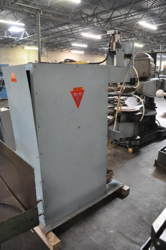 120 KVA H & H ROTARY SEAM / SPOT WELDER PRICE: Loaded on Truck, Our Warehouse, York, PA ………… $6,500.00 HMC Stock No. 21021 Machine Serial No. H5890 Machine Type: Seam New Date: 2007 24" Throat 14-1/4" Dia. Lower Table Non-Rotating 15" Long Rotating Upper Arm, 12-1/2" from Center of Rotation to the End of the Rotating Arm Lower Table Power Up Feed to Apply Weld Pressure Weld Pressure Ratio: 7.07 to 2 Skip Weld, Spot Weld, Constant Seam Weld Ro Man 120 KVA Welding Power Supply, New 2007 Primary Voltage, 440 Volts, Single Phase 50% Duty Cycle Water Cooled No Coolant Tank or Chiller, Machine was Connected to a Central Cooling System Rotary Arm Powered by Dayton Motor & Dart Micro Drive Controller H & H Welding Control Panel Overall Dimensions: 84" F-B x 31" L-R x 78" H