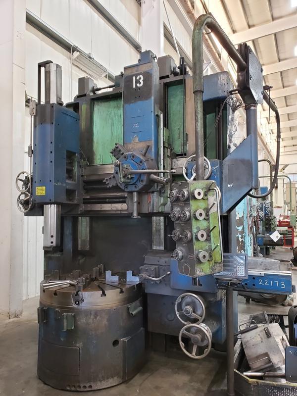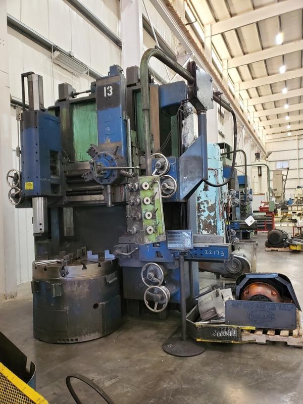 46" BULLARD CUTMASTER HIGH COLUMN VERTICAL BORING MILL PRICE: Loaded on Truck, Our Warehouse, York, PA ……$49,500.00 HMC Stock # 22173 Machine Serial No.: 30213 Machine Model No.: 75 Cutmaster New Date: 1956 Table Size: 46" Diameter, 4 Jaw Chuck Maximum Swing Side Head Up: 50", Side Head Down: 58" Maximum Under Rail: 62" Turret Head Travel Left to Right: 30" Each Side of Center Vertical Stroke of Ram Head: 42" Vertical Stroke of Turret Head: 30" Vertical Travel of Side Head: 38-3/4" Horizontal Travel of Side Head Ram: 26" (20) Table Speeds: 6.8 to 250 RPM Feeds To Each Axis: .0006 to .125 TPR EQUIPPED WITH: (1) Manual 5 Sided Turret Type Rail Head (1) Ram Type Rail Head (1) Side Head with 4 Sided Turret Type Tool Holder (8) Table with Bolt On Hard Reversible Top Jaws, Independently Adjustable (1) Chuck Wrench (2) Bullard 3 Sided Tool Holders (3) Round Bar Type Tool Holders Satin Chrome Dials and Inch Scales with Set Clips on Each Axis 4 Axis Newall DP1200 Digital Readout on 2 Axis on Each Rail Head Full Pendant Control of Feeds, Speeds and Rapid Traverse and Table Start Stop Flush floor Design Custom Removeable Table Area Guards Hard Replaceable Rail Ways, Soft Vertical Column Ways in Very Good Condition Side Head Goes Below Table Top Level Bijur One Shot Manual Lubrication Systems on Each Axis 30 Hp Main Motor, Wired for 3 Phase 60 Hz 220 / 440 Volts, Presently 440 Volts Assorted OEM Schematics and Drawings Overall Machine Height with Pendant Bracket Removed: 150" (12.5') (can't go lower) Shipping Dimensions: 142" LR x 117" FB x 150" High x 58,600 Lbs. (motor & accessories not included)