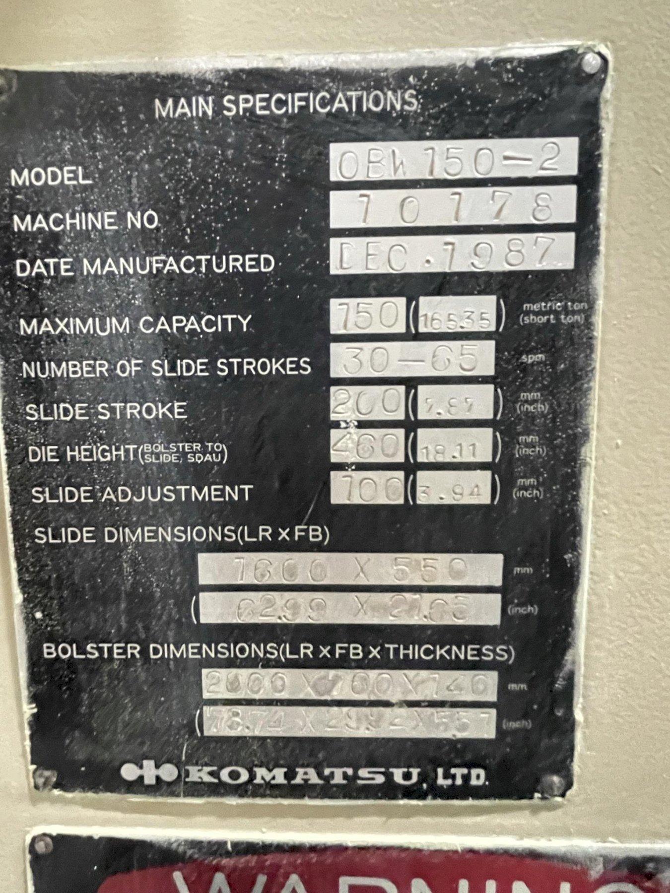 150 ton Komatsu Double Crank Used Mechanical Metal Stamping Press For Sale Model OBW150-2, Year