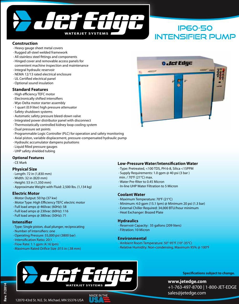 The Mid Rail Gantry is powered with a Jet Edge UHP waterjet pump. Jet Edge manufactures the widest range of waterjet pumps in the industry, 36,000 psi, 60,000 psi and 75,000 psi models are available from 30-280 hp.