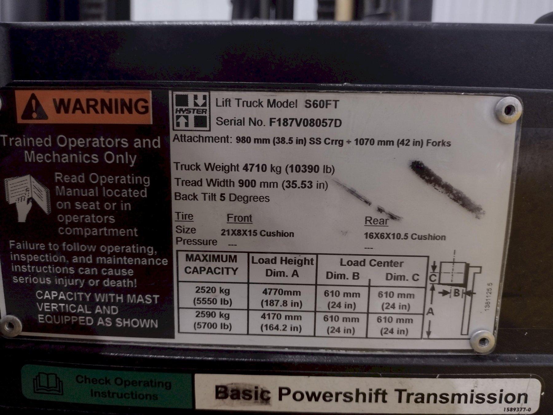 6000 LBS HYSTER MODEL #S60FT FORTIS LP-GAS FORKLIFT: STOCK #18833