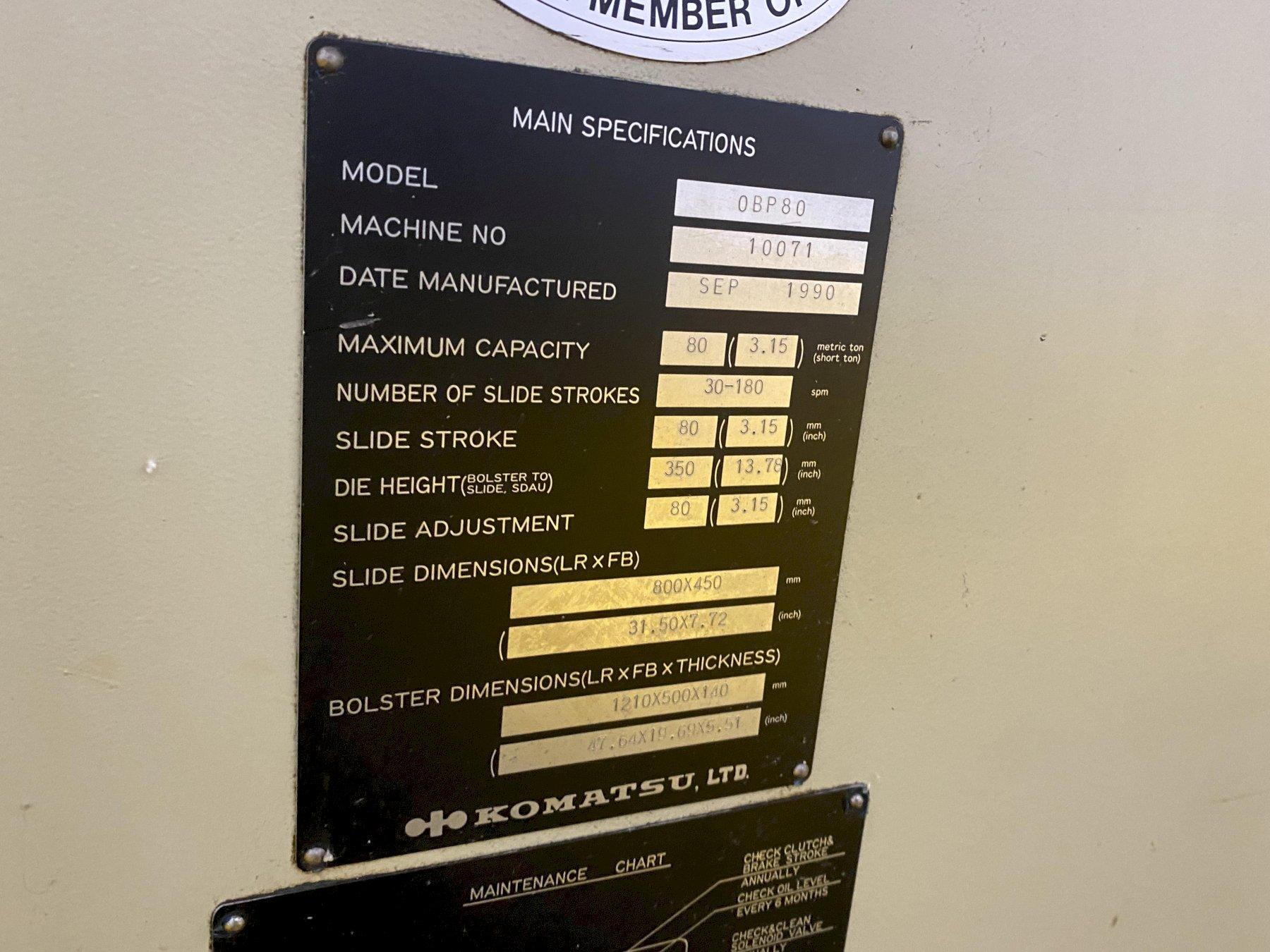 80 TON KOMATSU MODEL #OBP80 OBS GAP FRAME STAMPING PRESS, 3" STROKE: STOCK #18758