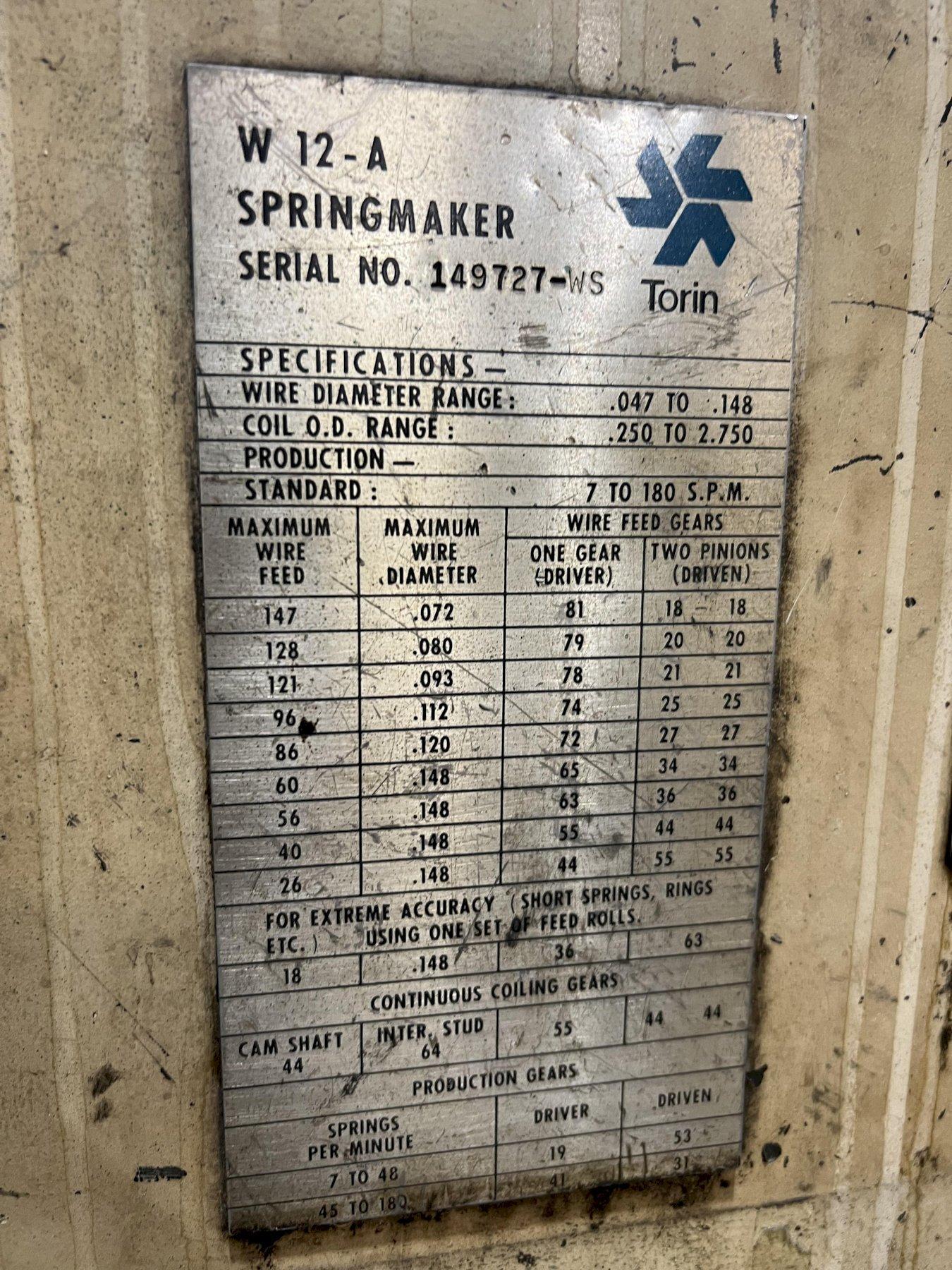 .148" X 2.75" TORRINGTON MODEL #W12A WIRE SPRING COILER / COIL MAKING MACHINE: STOCK #18806