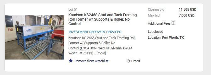12 STAND X 10" KNUDSON MODEL #KS-2468 STUD & TRACK FRAMING ROLLFORMER, WITH AMS CONTROLS: STOCK