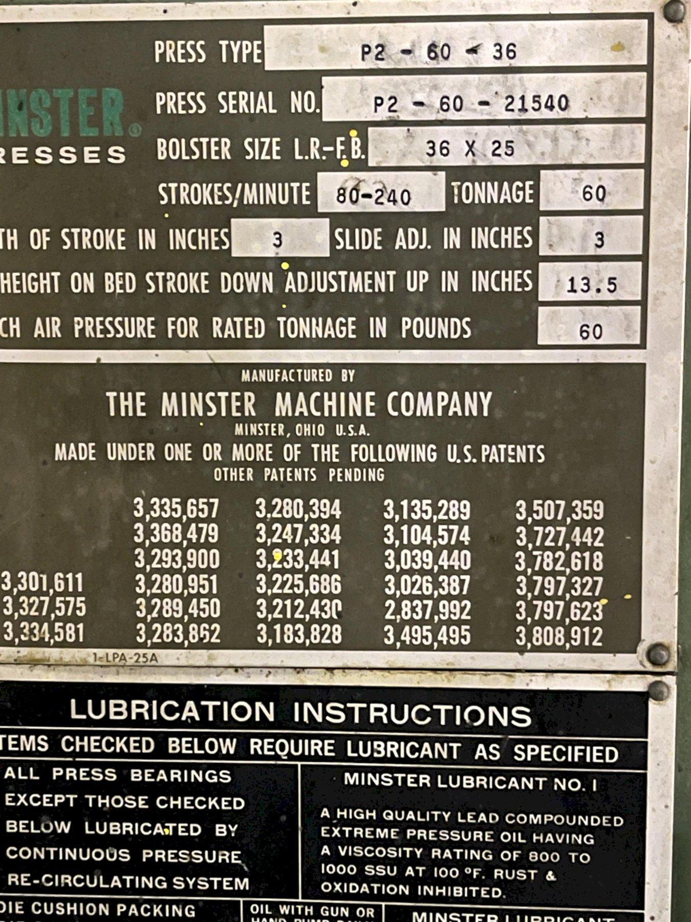 60 ton Minster Model P2-60-36 Piece-Maker Used Highspeed Straight Side Mechanical Metal Stamping
