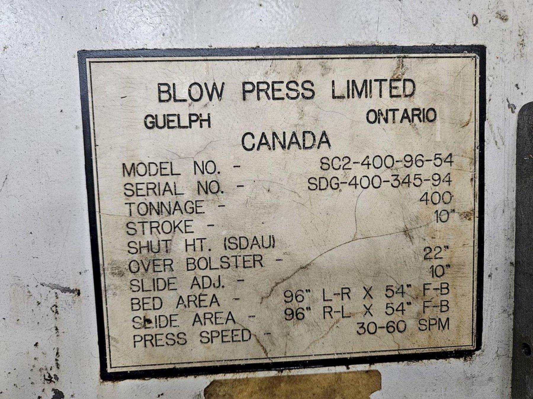 Used Blow Straight Side Mechanical Press400-ton Blow Model # SC2-400-96-54Serial Number SDG-400-345-94