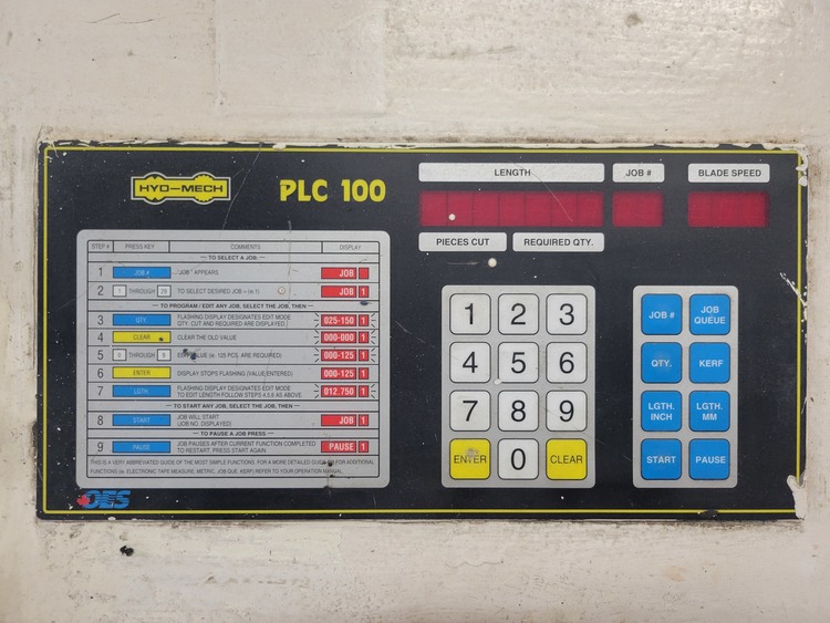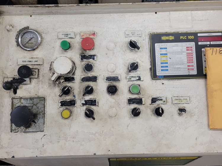 Hyd-Mech programmable PLC 100 Control, Full stroke hydraulic vises, 10 HP Variable speed drive, Coolant system with Wash down hose, 40" Shuttle stroke, Carbide Blade guides, Solid One piece weldment.