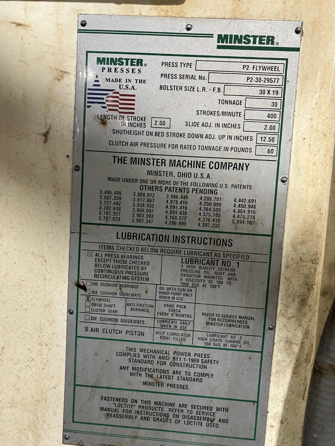 30-ton Minster P2-30-30 "Piece-Maker" Straight Side High Speed Mechanical Metal Stamping Press F