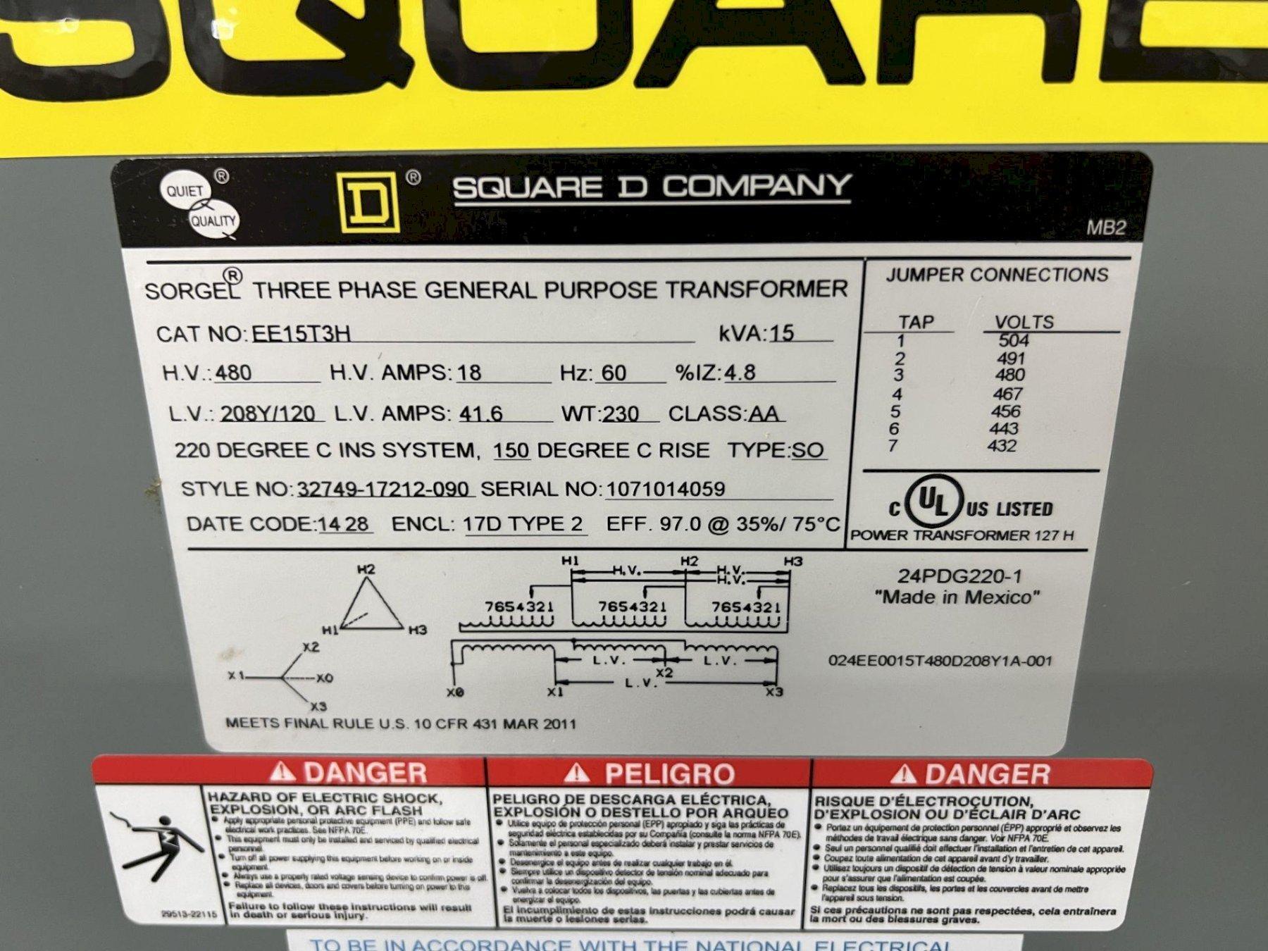 15 KVA SQUARE D 480 V - 208Y/120 V GENERAL PURPOSE TRANSFORMER : STOCK #19164