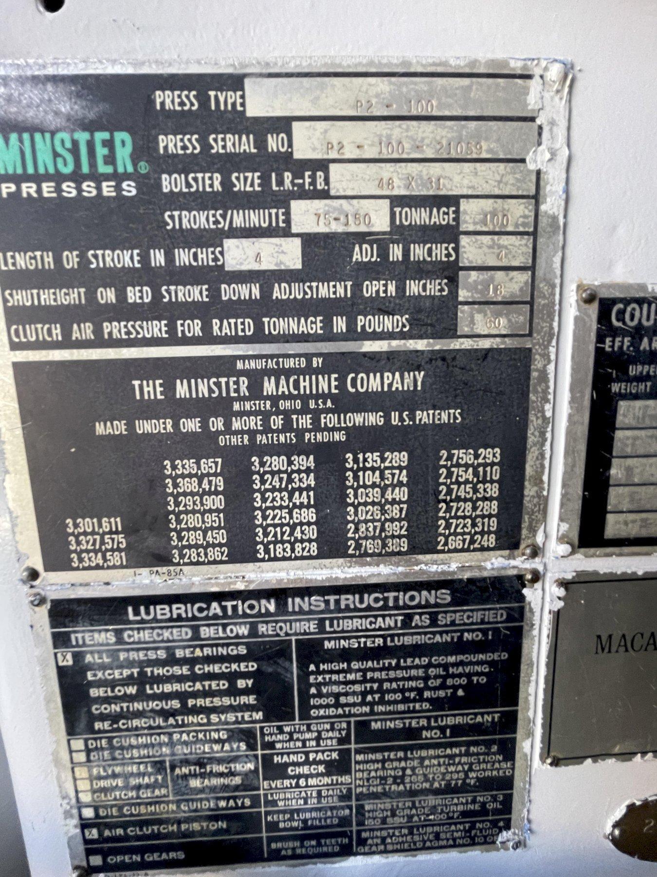 100 ton Minster P2-100-48 Piece-Maker Used Mechanical Metal Stamping Press For Sale, Year 1975