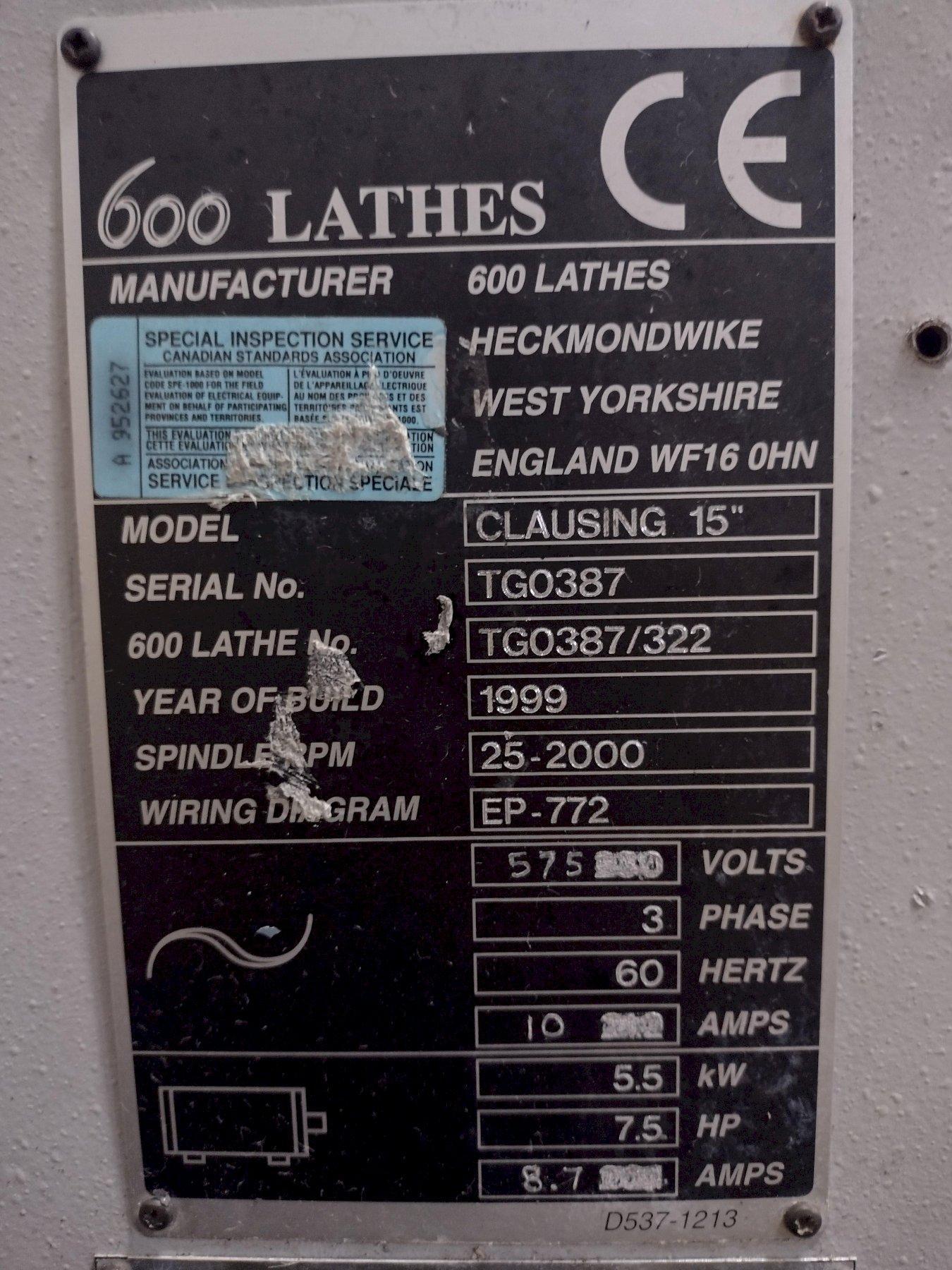 15" X 50" CLAUSING COLCHESTER MODEL #600-15" ENGINE LATHE, NEW 1999, 2-1/8" HOLE: STOCK #18166