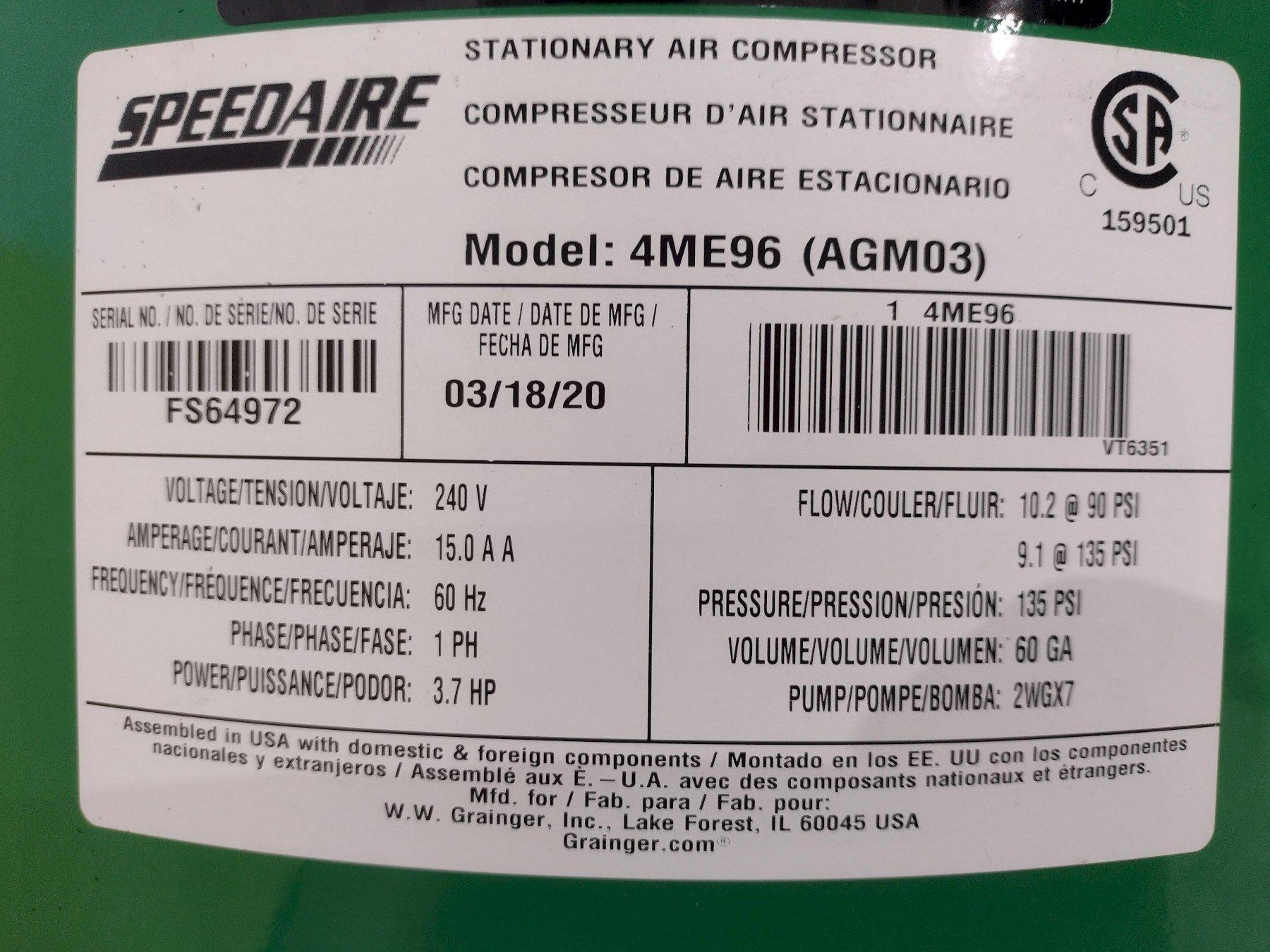 3.7 HP SPEED MODEL #4ME96 VERTICAL AIR COMPRESSOR: STOCK #20148