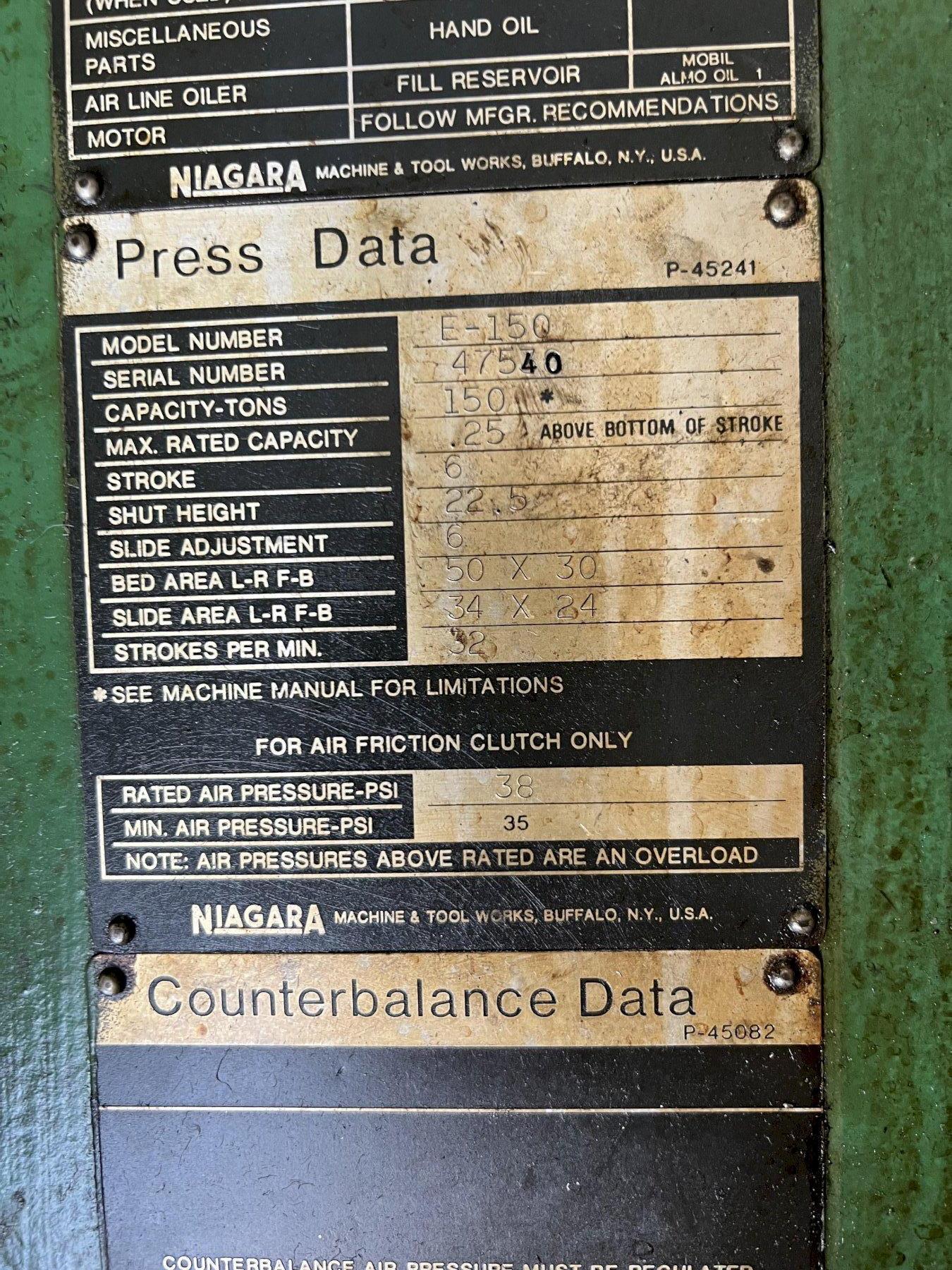 150 TON NIAGARA MODEL #E-150 GAP FRAME PRESS, 6" STROKE: STOCK 17175