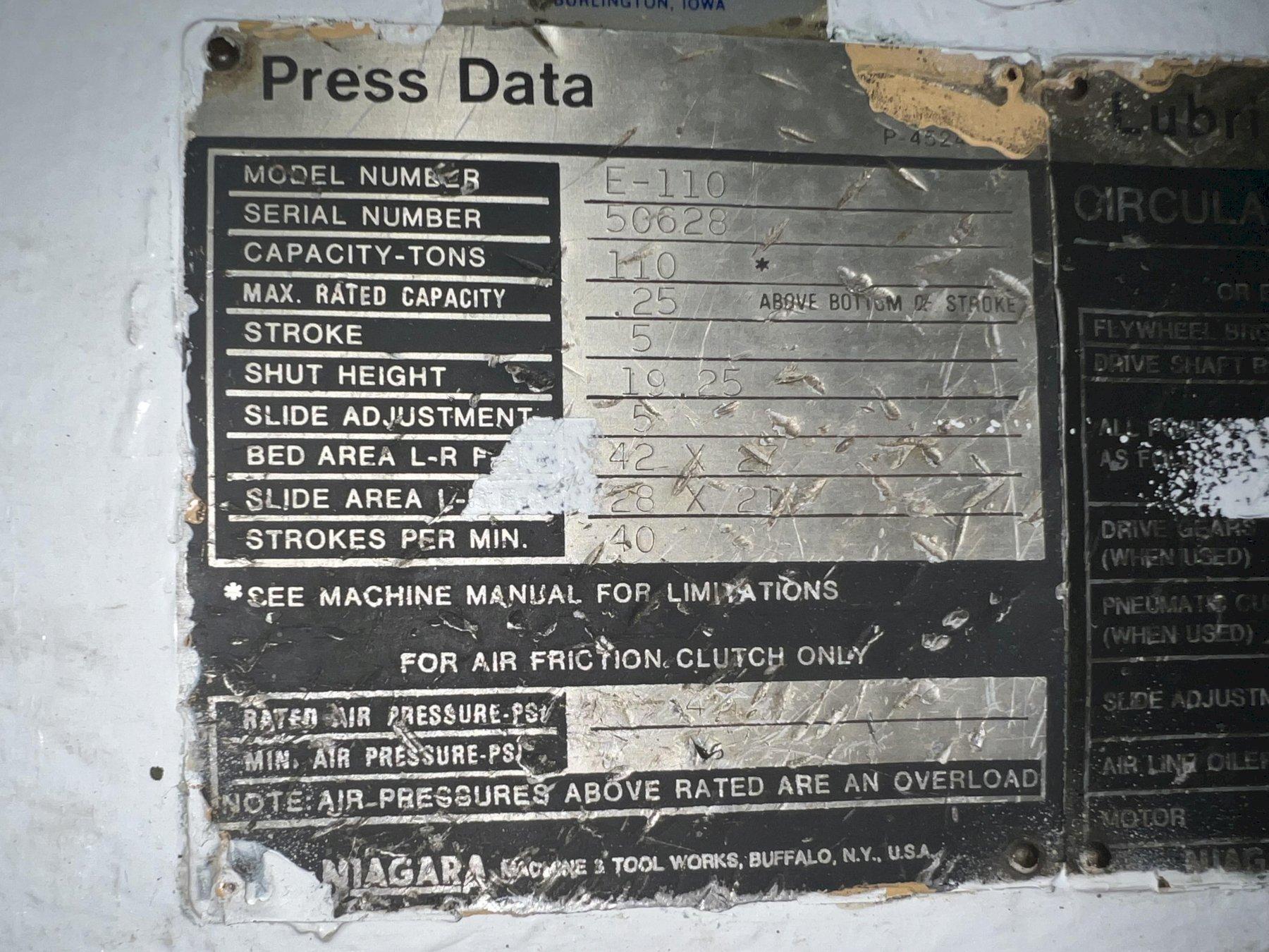110 TON NIAGARA MODEL#E-110 MECHANICAL GAP FRAME PUNCH PRESS, 5" STROKE: STOCK 17122