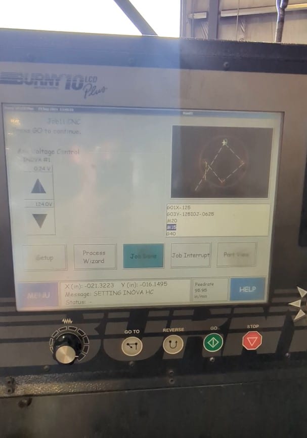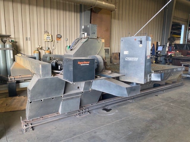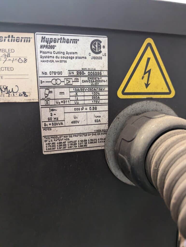 Windows XP Operating System and integrated PC-based Burny 10 LCD Plus CNC Controller, Hypertherm HPR260 Power source, Cutting surface is 6′ x 14′.