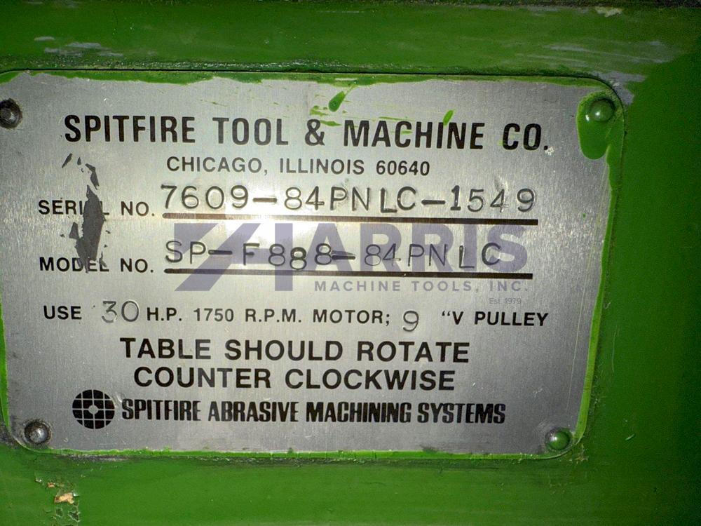 84" SPITFIRE, MODEL 84PNLC, (4) PNEUMATIC HOLD DOWNS, CONDITIONING RINGS, VARIABLE SPEED TABLE,