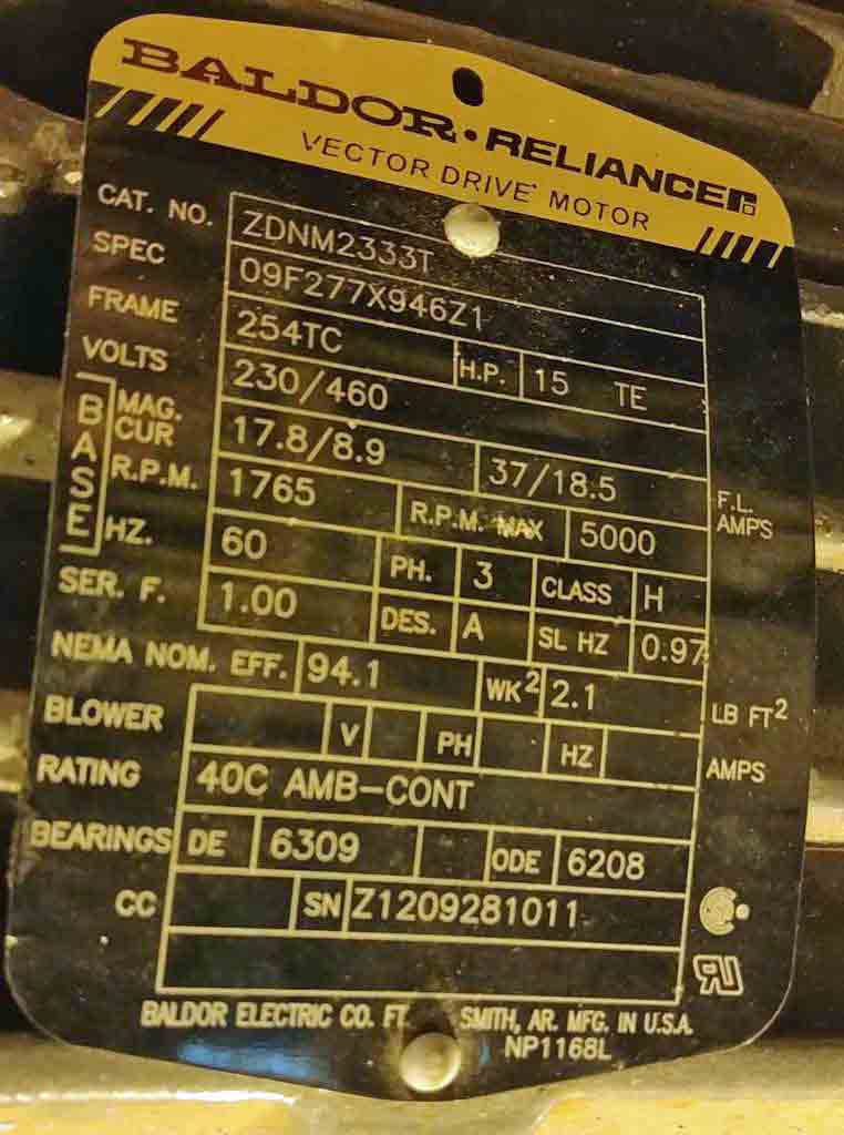 -Main Drive Motor: 15 HP, 1765 RPM, Baldor Vector Drive