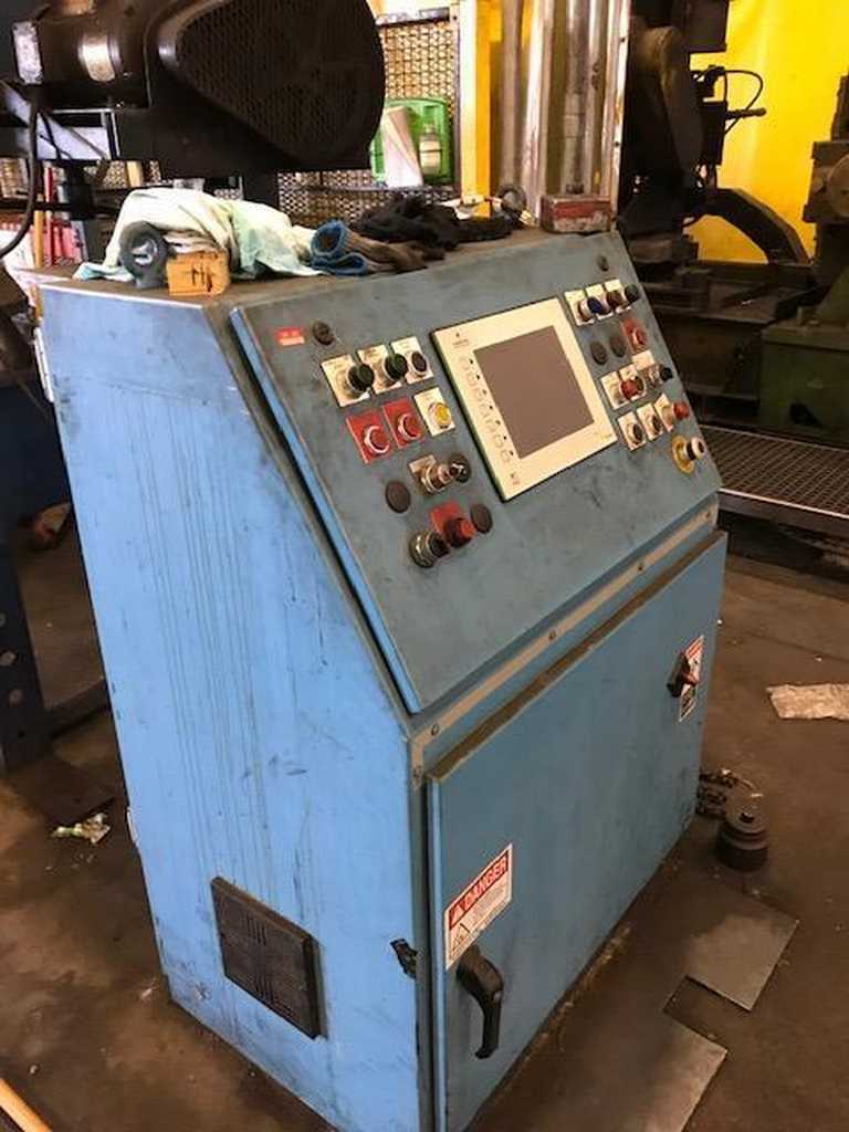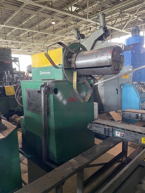 -3.5" x 3.5" Square -3" x 5" Rectangle (tooling in Mill) -Line Direction: Right to Left -Material Thickness: 0.135" Consisting of the following: -Dahlstrom Coil Car: AC Motor Drive AC Motor Jack Screw Lift Floor Mounted Rails -Dahlstrom Uncoiler: 18" Wide with 4 Keepers AC Gear Motor with Clutch Drive Hydraulic Expansion 16" to 22" ID 72" Coil O.D. Self-Contained Hydraulic Power Unit 15,000 lb. Weight Capacity -Free Standing Overarm Holddown: Loop Control Arm -Dahlstrom Straightener: 5 Roll - 2 over 3 Dual Entry Pinch Roll Side Guides -Kent Shear End Welder: Model: 20-250-DSAA 20" Strip Width 0.250" Strip Thickness Entry and Exit Squaring Guides Dual Hydraulic Strip Clamps on Bias Hydraulic Blanking Shear Miller Square Wave 250 -Kent Vertical Floop Accumulator: Model: BEC 3122 16" Maximum Strip Width -AEF Forming Mill: Entry Side Guides Pass Line Roll 11 Stands Bottom Drive 14" Roll Space 24" Horizontal Spacing 8" Vertical Adjustment (last 3 Stands) 4 Roll Weld Box Scarfing Tool Scarf Recoiler - AC Drive -150 HP AC Main Drive Motor -Thermatool VT 200 Welder: 375KV Transformer 480V -10' Long Coolant Trough: -AEF Sizing Stand: 1 Driven Stand 14" Roll Space Pinch Roll Single Side Turkshead 6" x 6" Max. Opening -Free Standing Turkshead: 6" x 6" Max. Opening -Flying Cutoff Saw: Hydraulic Clamp - Dual Vise AC Motor Drive Hydraulic Cylinder Die Accelerator -(2) 45' Long Conveyor Runout Sections: 40' Long Discharge Table 8' Deep Belt Type Top -(2) 40' Long Stacking Tables -Removed and in storage: Toledo, OH.
