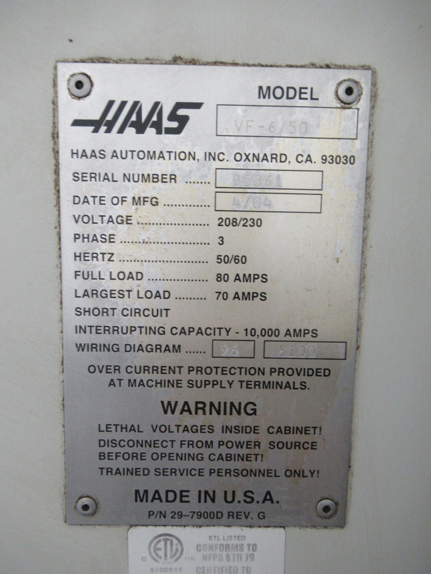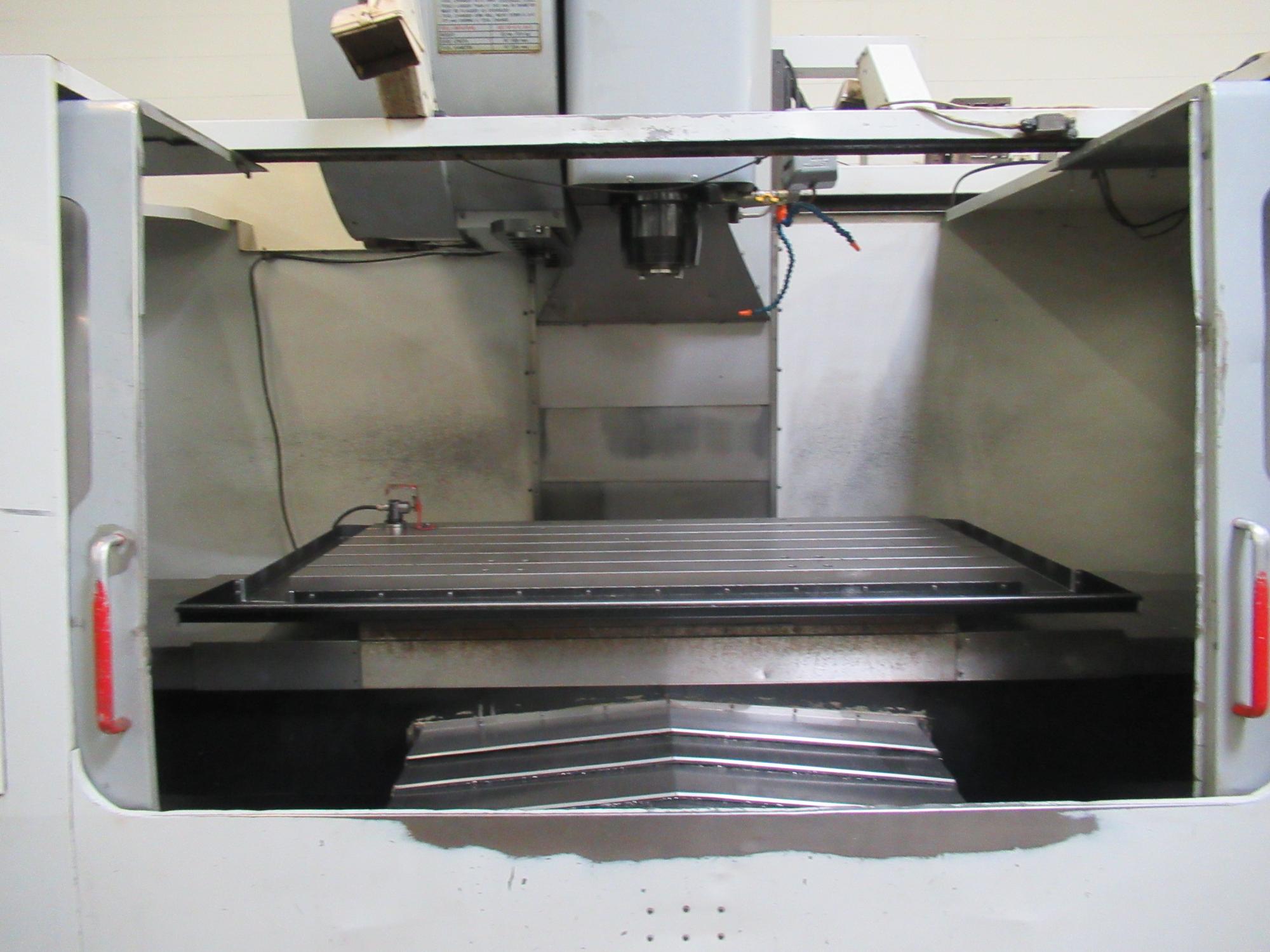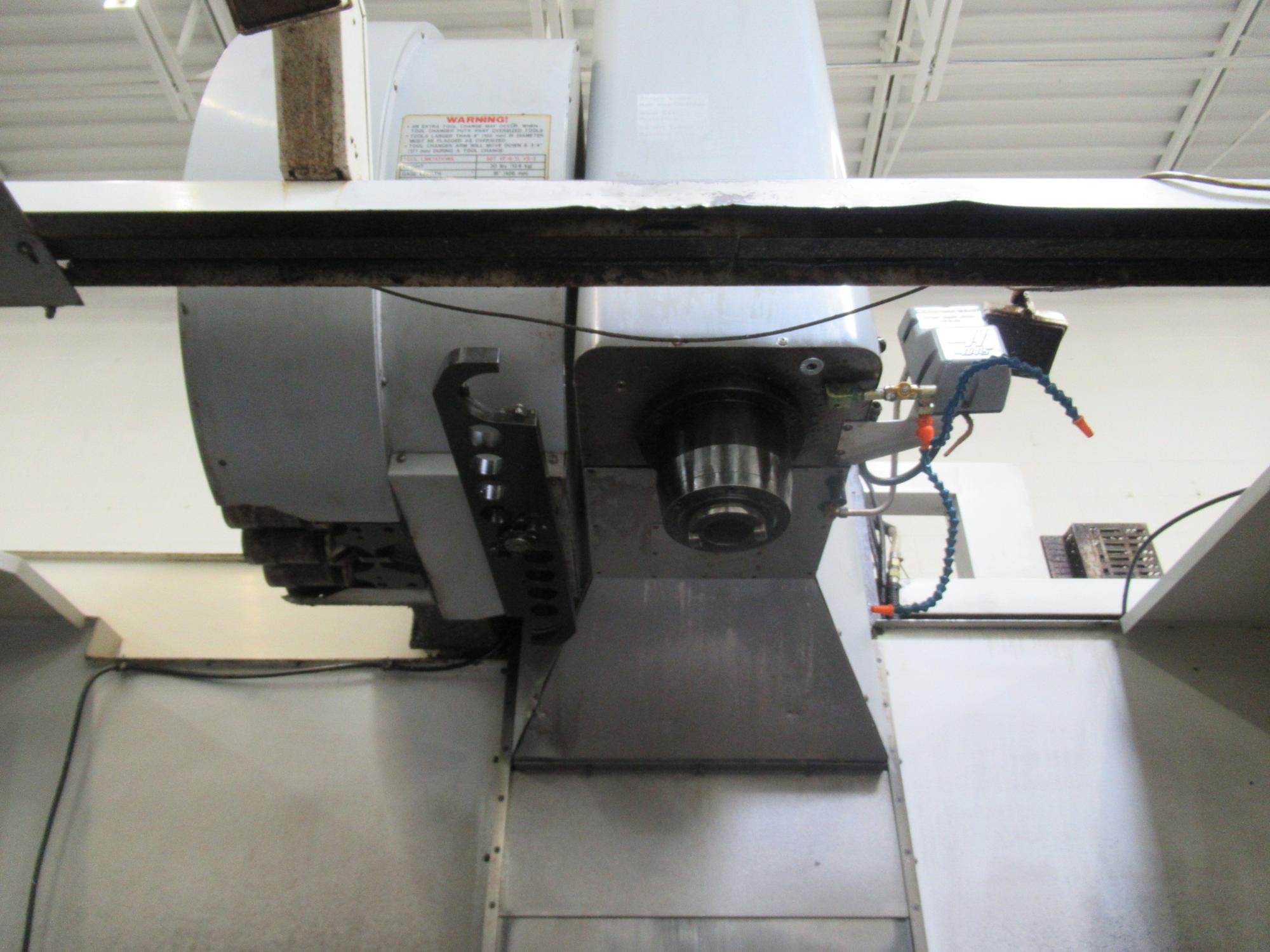 Haas 32-Bit CNC Control, 7500 RPM CAT-50 Taper Gearbox Spindle, 30 Station Twin-Arm Automatic Tool Changer, 4th Axis Brush Style Drive and Wiring, Through Spindle Coolant, Tool and Parts Probing System, High Intensity Lighting, 3-1/2" Floppy Drive, Chip Auger, Coolant System with Tank & Pumps.