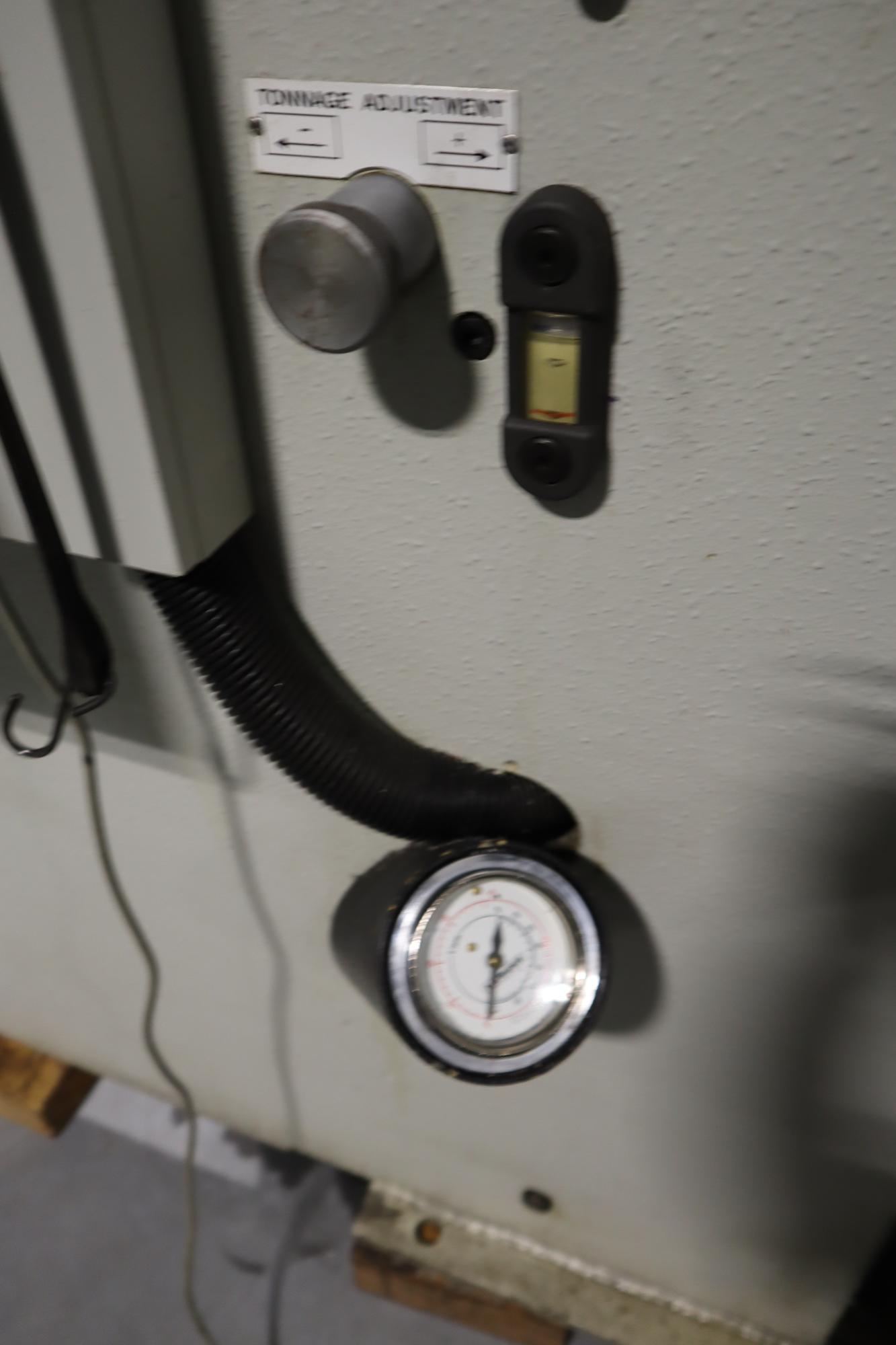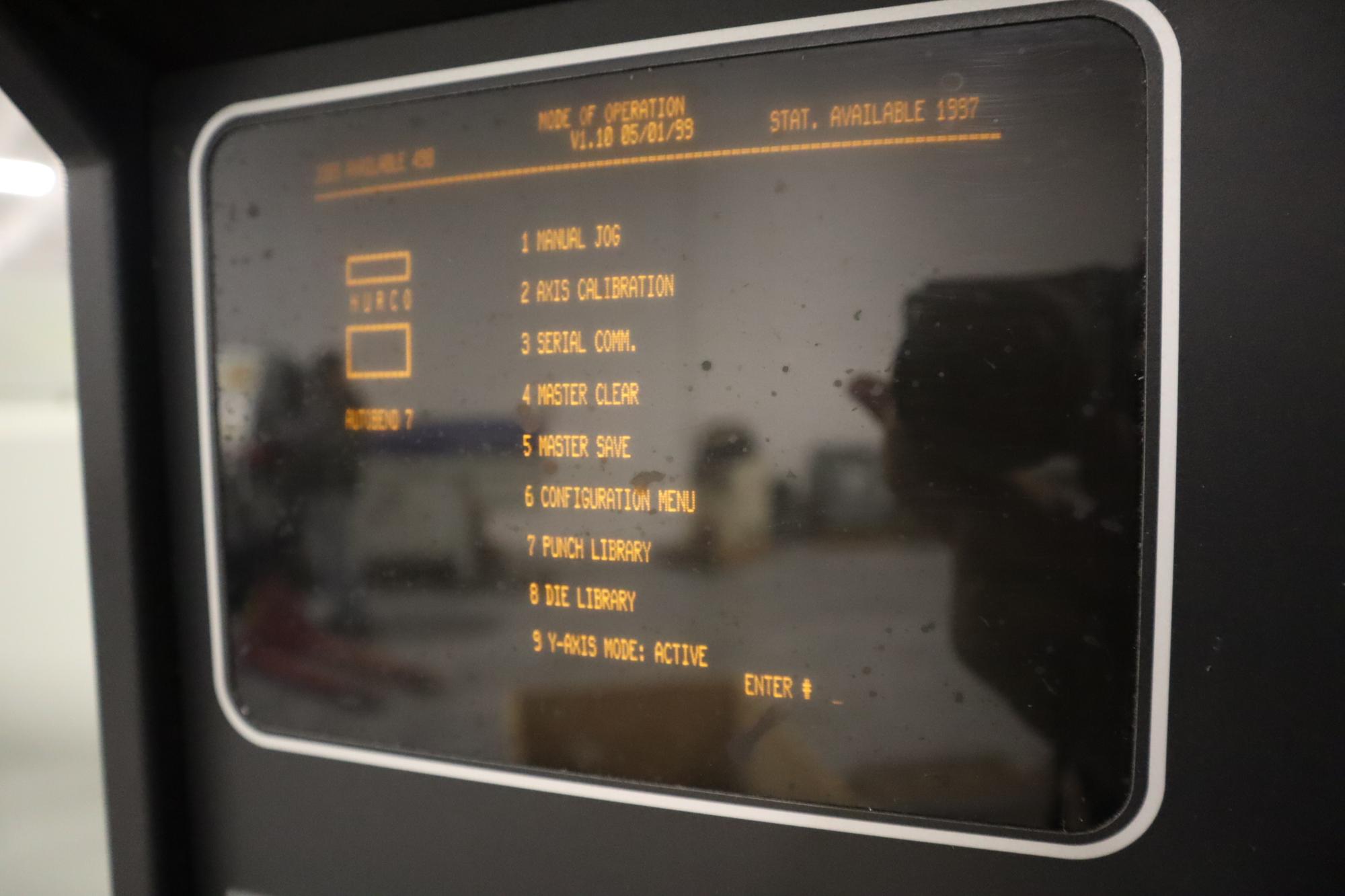 Hurco Autobend VII CNC Control, Programmable Upacting Ram, Programmable X and R Axis Backgauge, Ram Clamps, Lower Die Holders, Tonnage Controls, Ram Tilt Control, Large Assortment of Dies and Die Holders, Remote Foot actuator, Manuals.