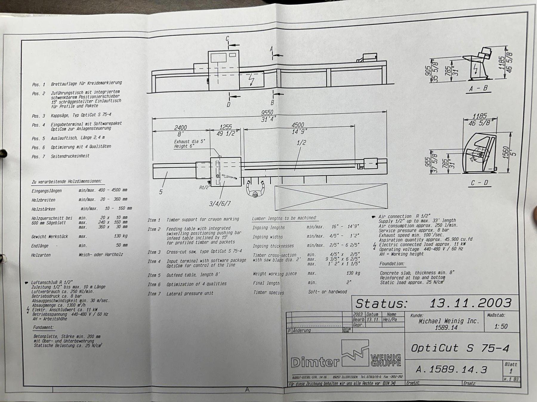 6" HIGH X 14" WIDE DIMTER OPTICUT MODEL #S75 CROSS-CUT AUTOMATIC WOOD SAW, NEW 2003: STOCK #229