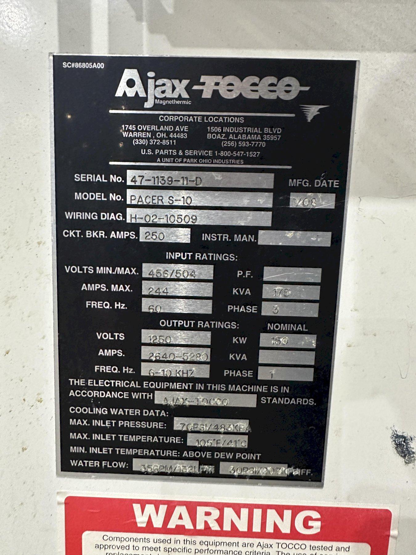 150 KW AJAX-TOCCO MODEL PACER-S10 HEAT INDUCTION POWER SOURCE, 6-10 KHZ, NEW 2008: STOCK #22587