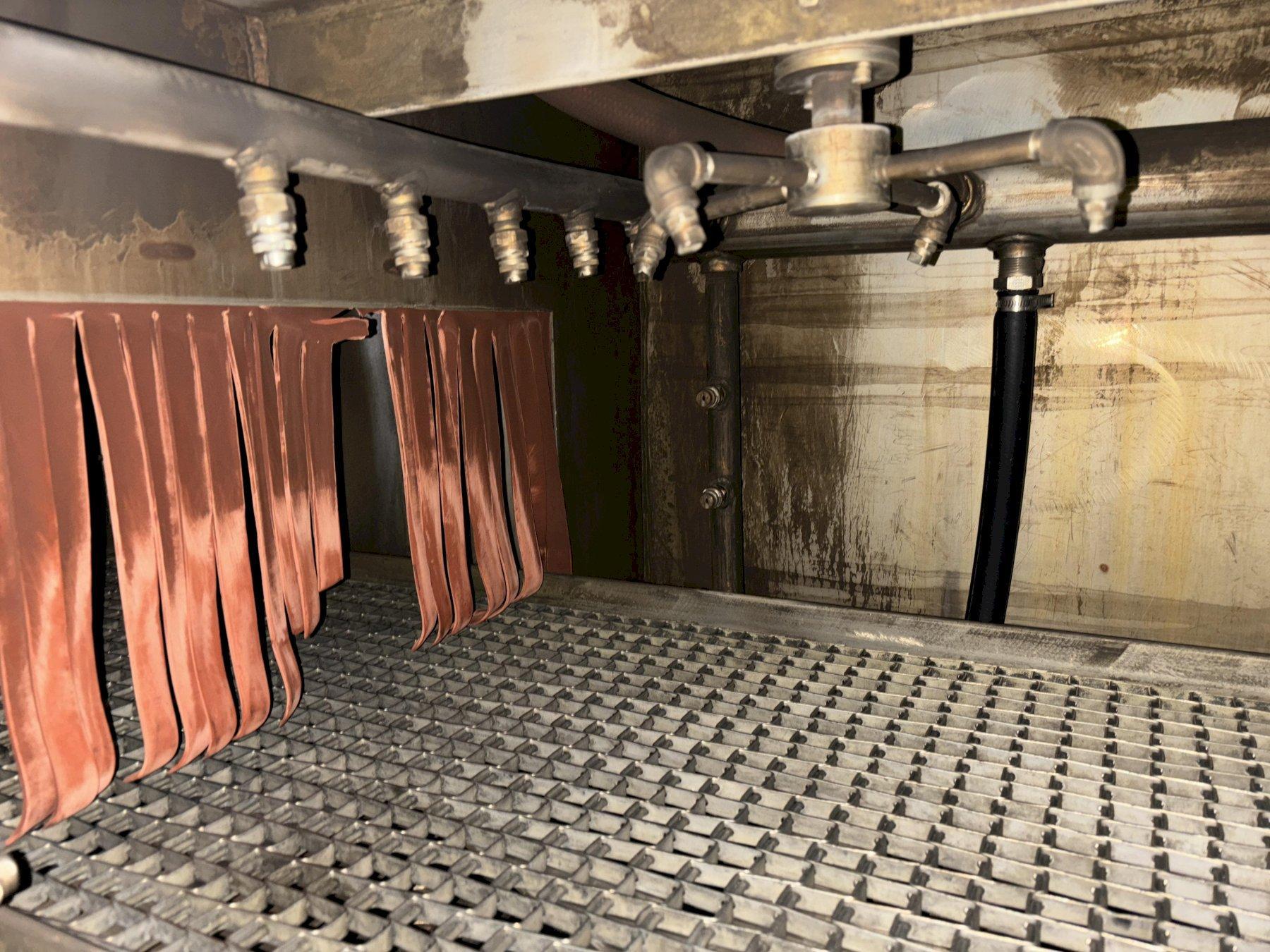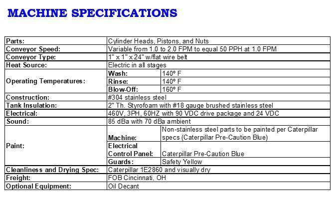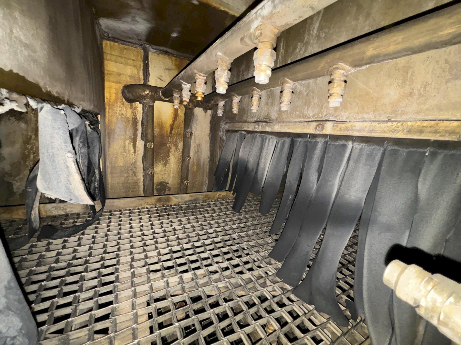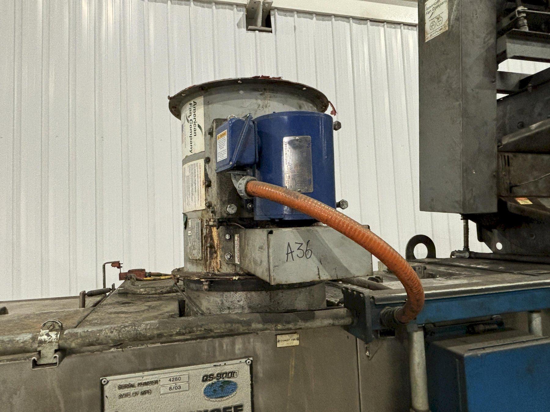 The blow-off is a re-circulating type with the capability of introducing approximately 20% fresh air. The motor driven fan circulates the air supply, as the air passes through fan and through the outlet it is directed into the plenum. The plenum is a chamber that the air knives and blow-off pipes are welded to. The pressurized air flows into each knife and pipe and is directed onto the parts. The design of this air knife and pipe allows the velocity of air to accelerate as it passes through the orifice. (Approximately 10,000 - 12,000 FPM).