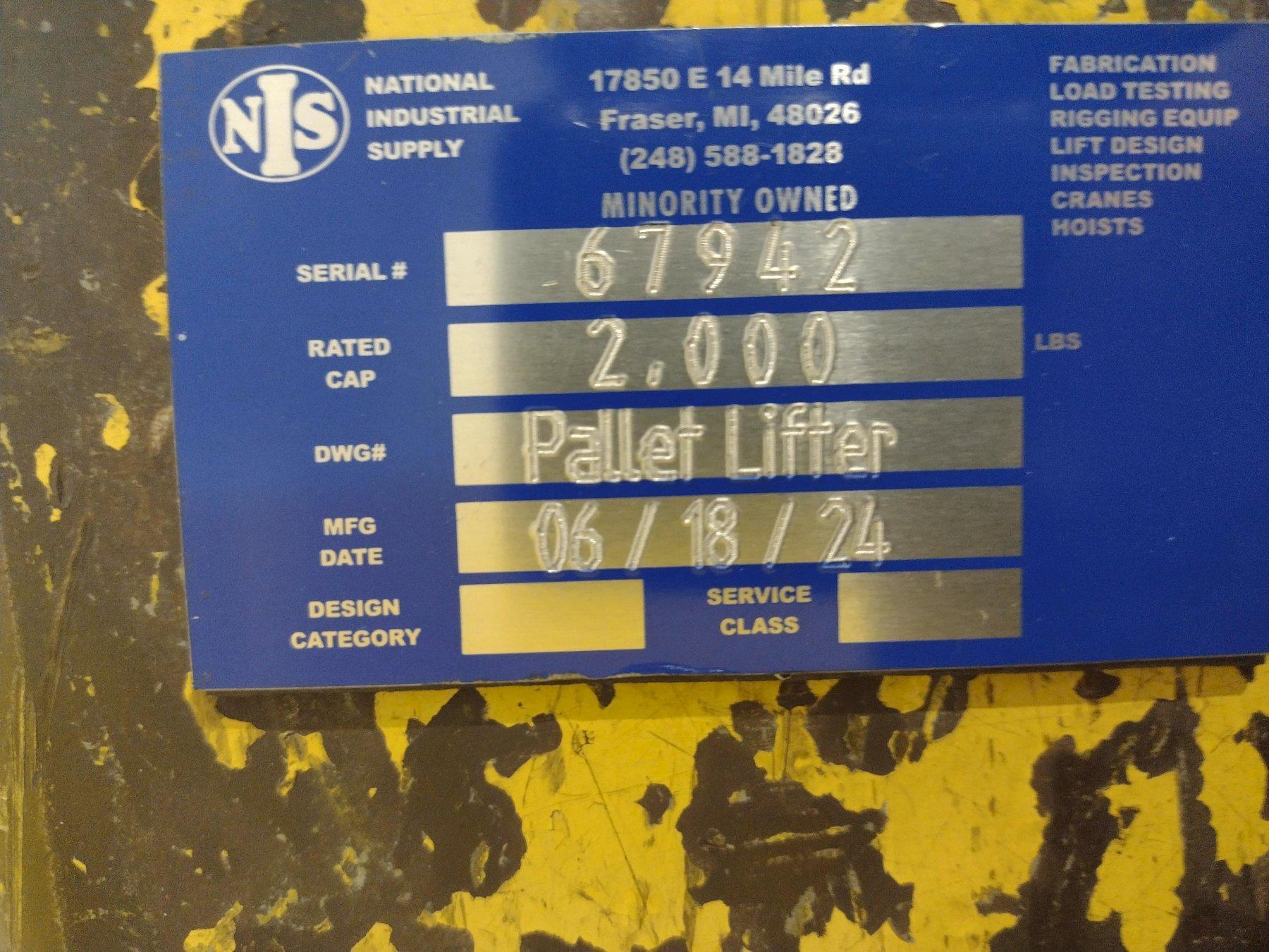 2,000 LB x 42" x 36" NATIONAL IND PALLET LIFTER CRANE ATTACHEMENT: STOCK #22368