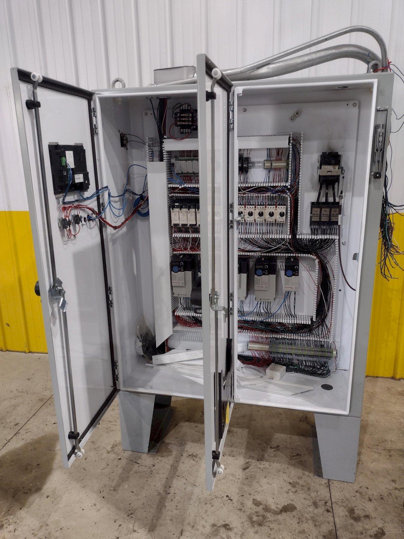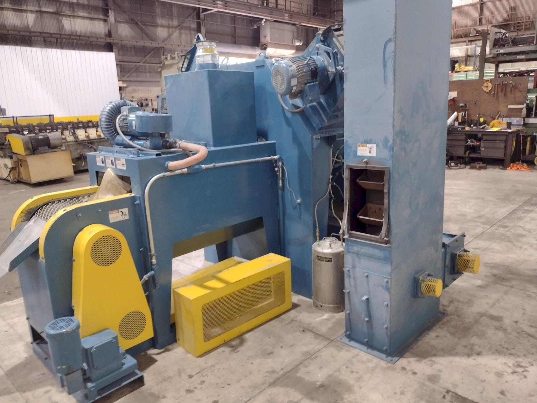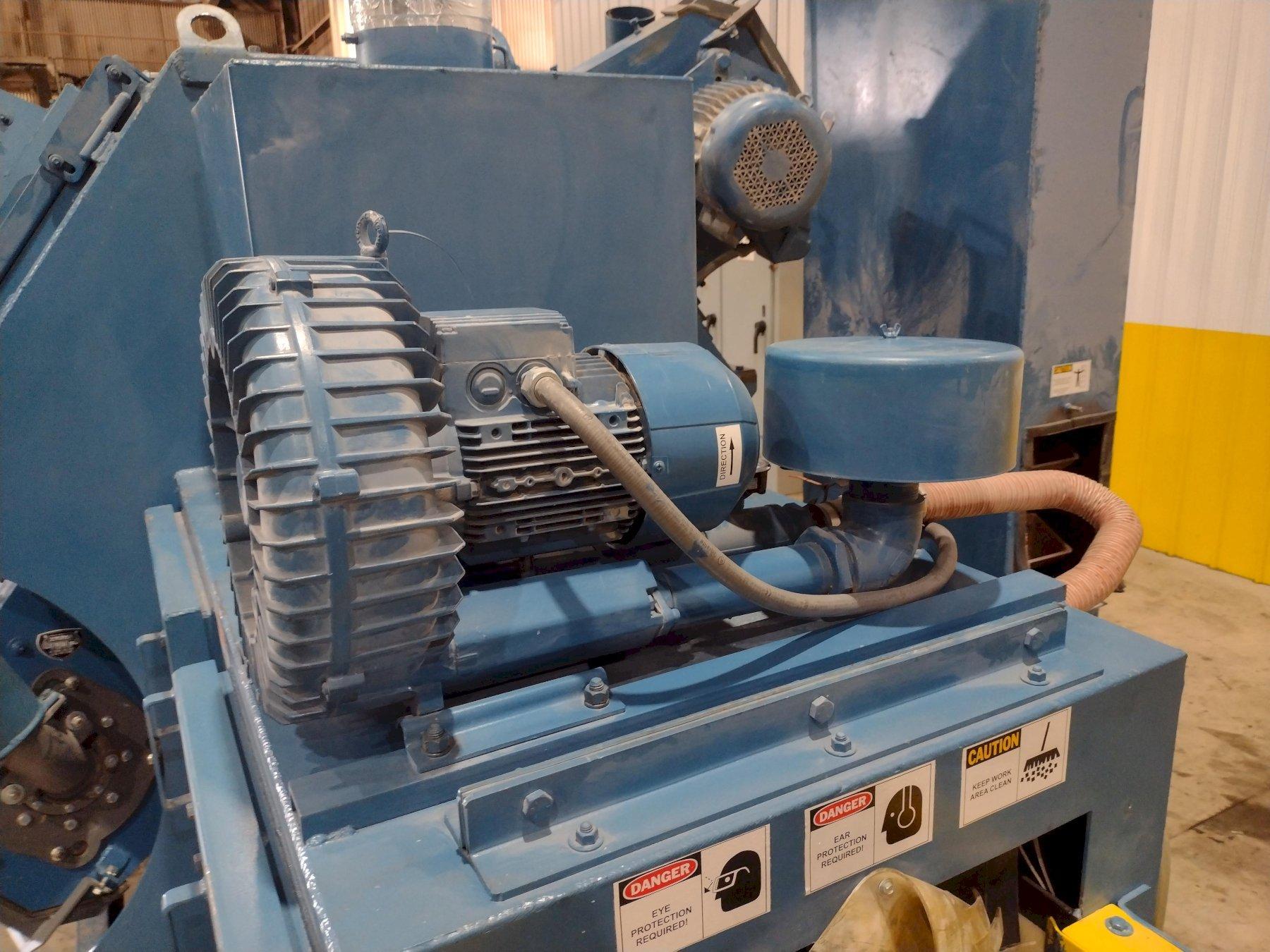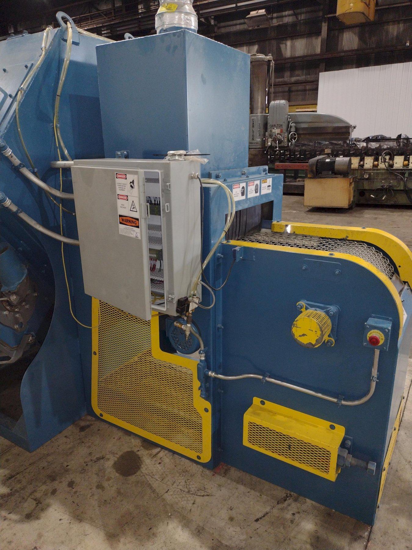 This new series for de-flashing plastic parts has many unique characteristics. The 4 blast wheels are not throwing steel shot but, rather a hard plastic media. This throwing technique requires the shot to have an additional solenoid for each blast wheel to reduce the static charge created during this process. This solenoid triggers a mist of an anti-static media to spray across the abrasive and reduce the static build-up. So, control on the wheel speed through VFD’s for each wheel and control of the mist is critical. These two processes are controlled by the program running in the PLC.