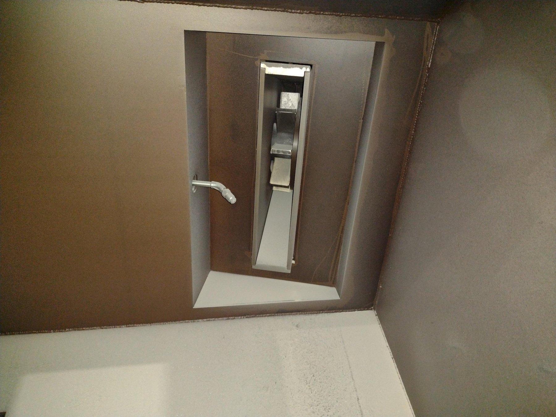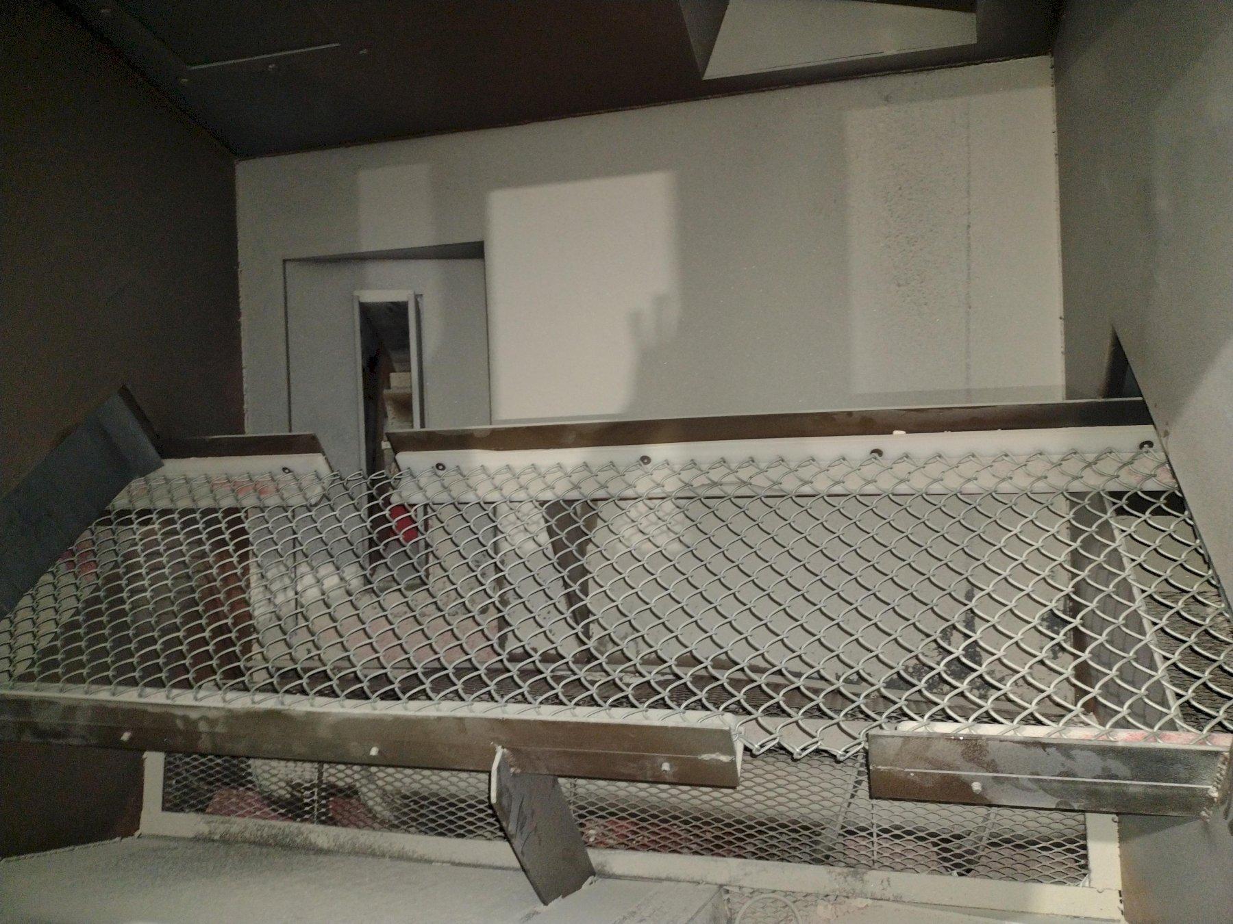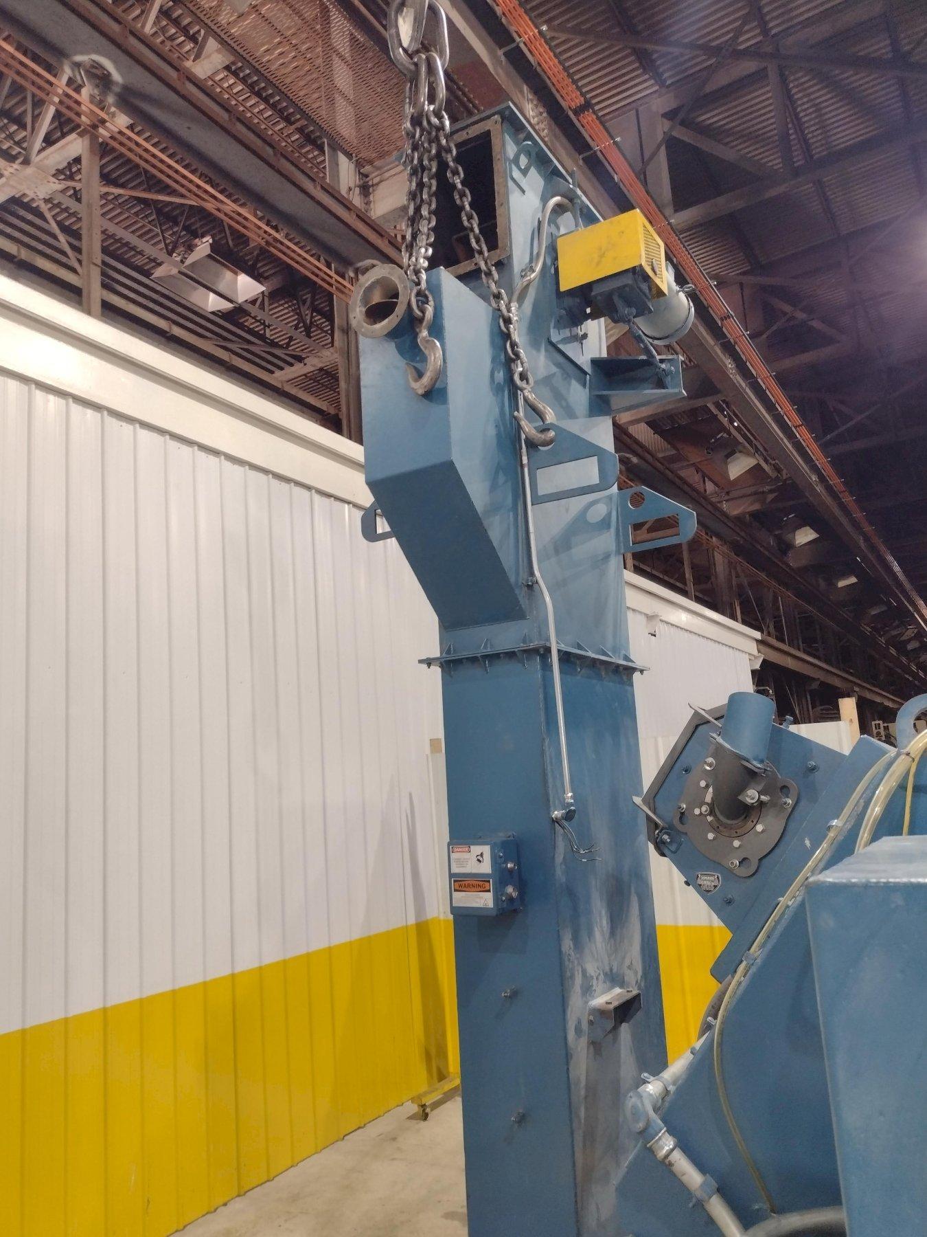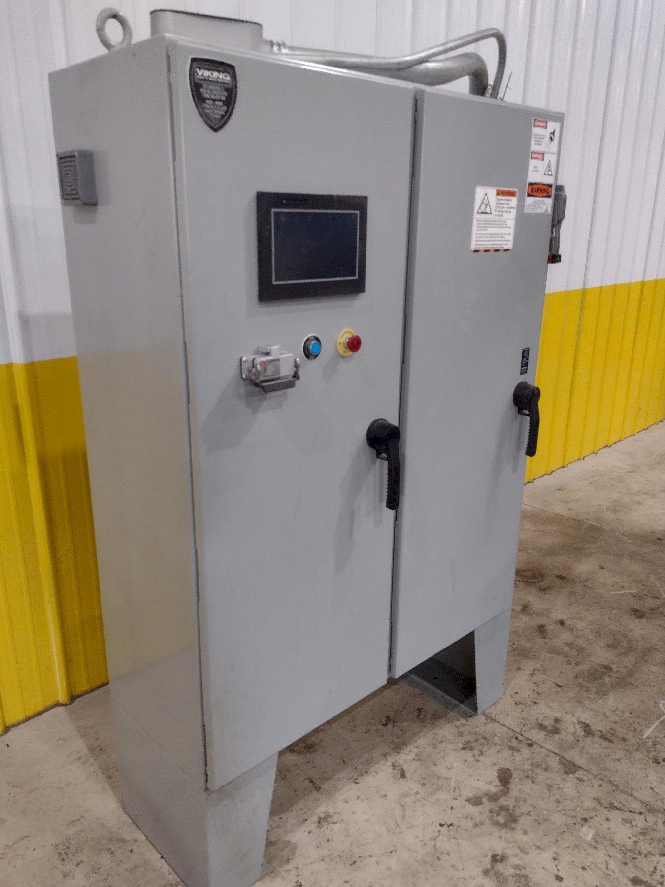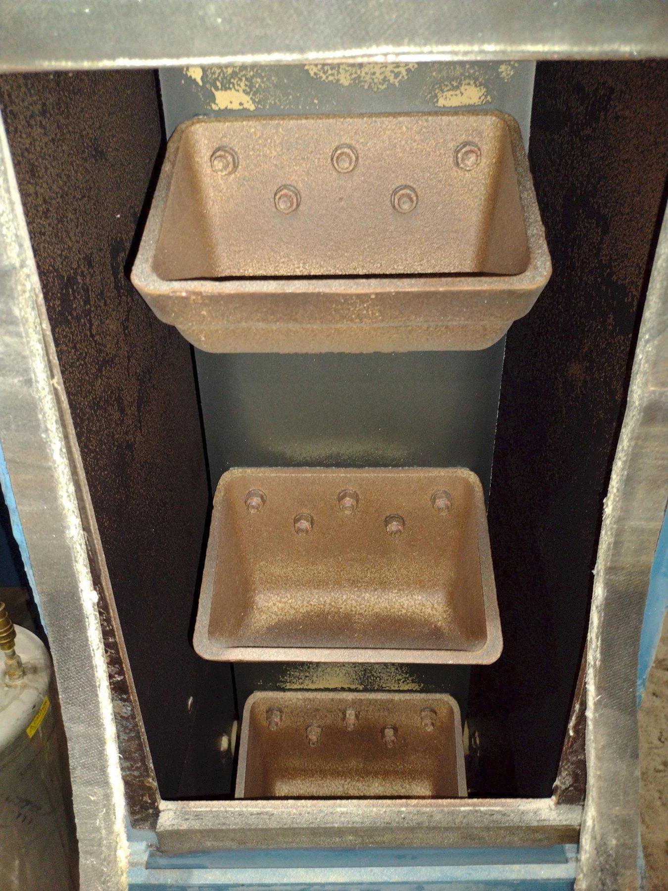 This new series for de-flashing plastic parts has many unique characteristics. The 4 blast wheels are not throwing steel shot but, rather a hard plastic media. This throwing technique requires the shot to have an additional solenoid for each blast wheel to reduce the static charge created during this process. This solenoid triggers a mist of an anti-static media to spray across the abrasive and reduce the static build-up. So, control on the wheel speed through VFD’s for each wheel and control of the mist is critical. These two processes are controlled by the program running in the PLC.