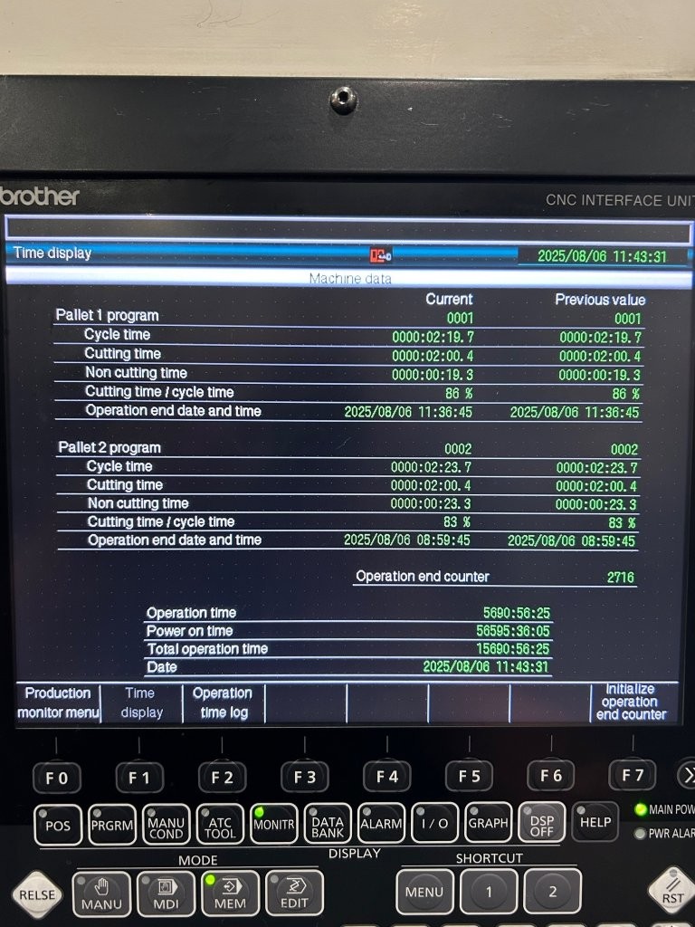 Brother CNC Control, Machine Hours: Operation Time – 5,690, Total Operation Time – 15,690, Power On Time – 56,595, Coolant Through Spindle, Coolant Tank & (2) Coolant Pumps