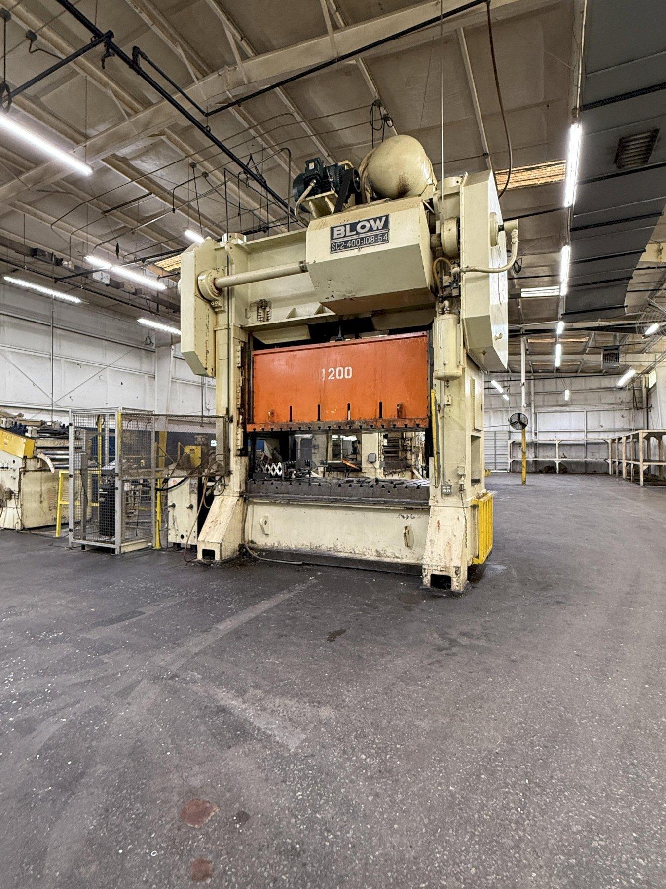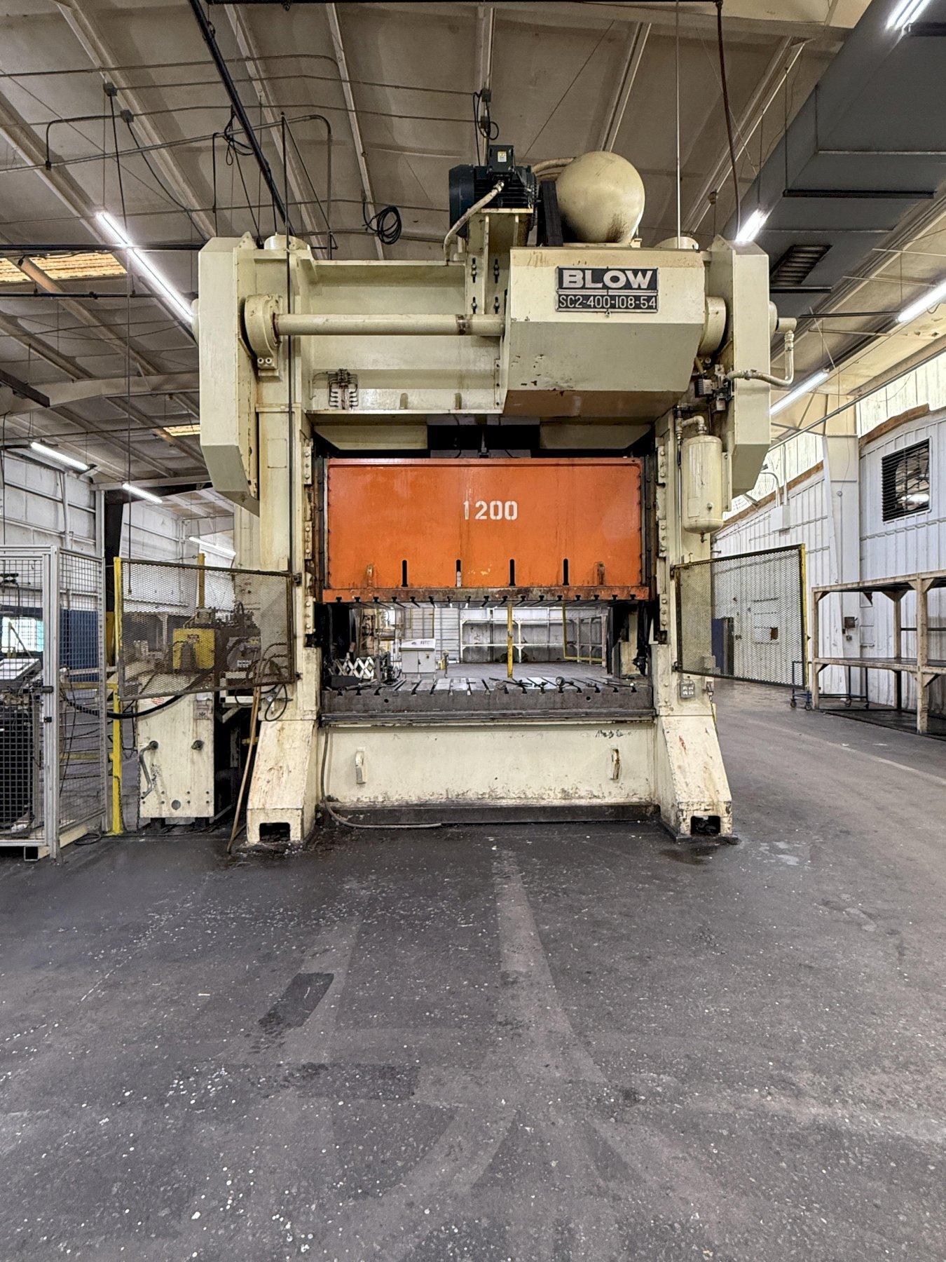 Maximize your production with this heavy-duty, Used 400-Ton Blow Straight Side Mechanical Press for sale. Ideal for metal stamping and progressive die operations, this double crank press offers superior rigidity and precision. The robust Blow Model SC2-400-108-54 features an expansive 108" LR x 54" FB Bed Area, perfect for large or tandem tooling setups.