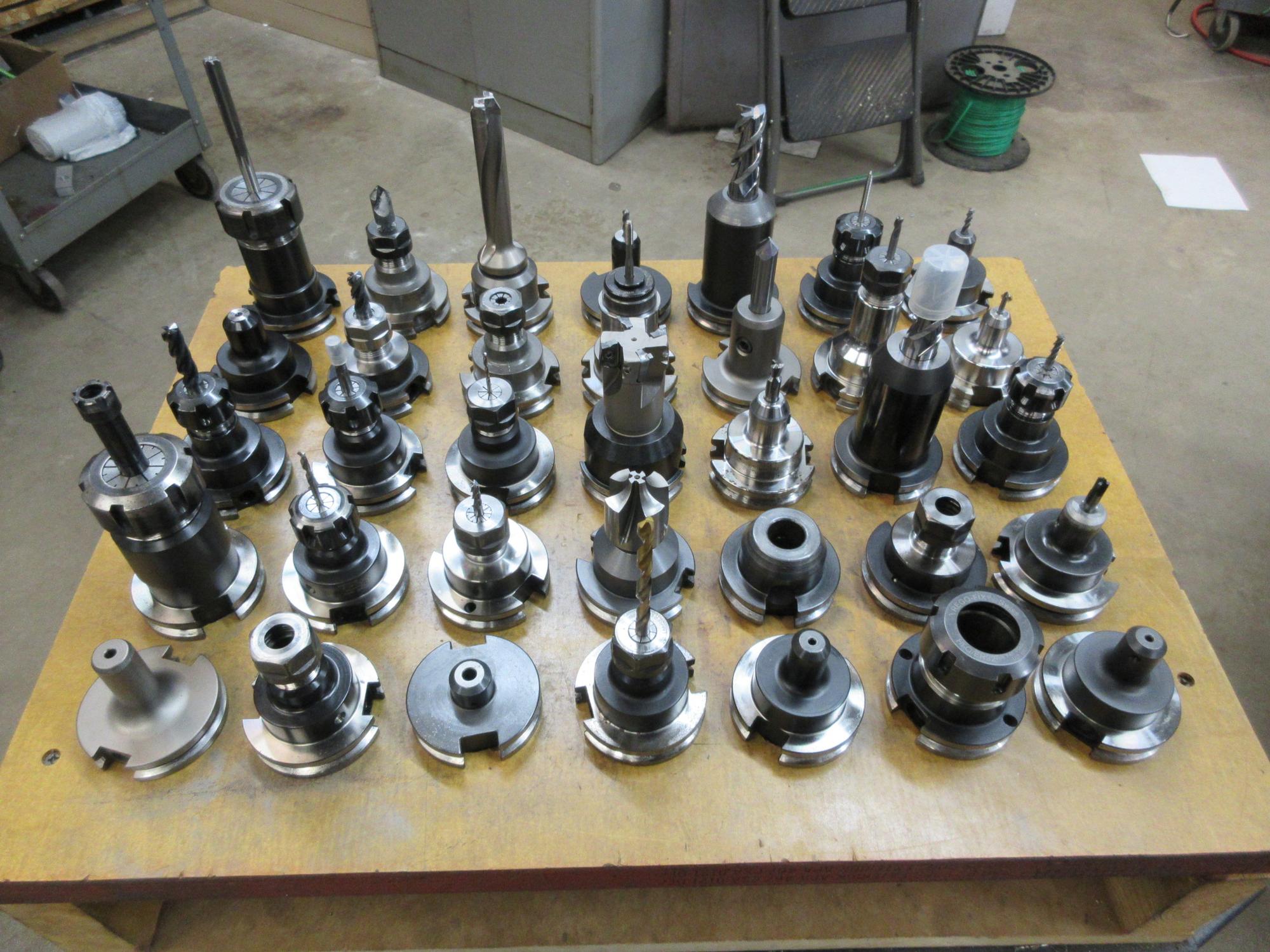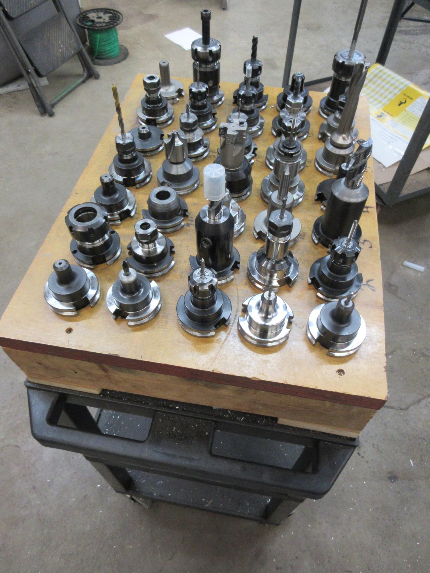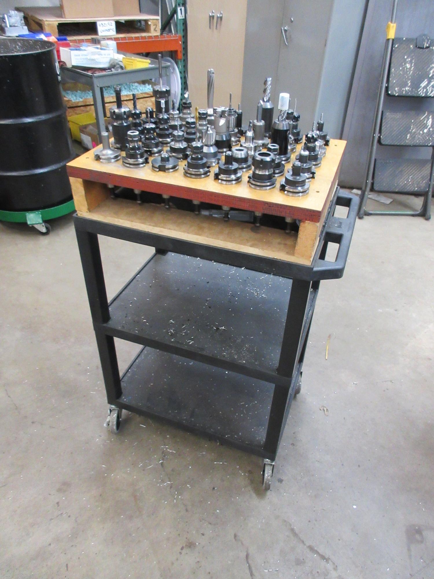 Lot 42: CAT40 Tool Holders (35) Assorted in Wood Rack Mounted on Uline Plastic Rolling 3 Shelf Cart