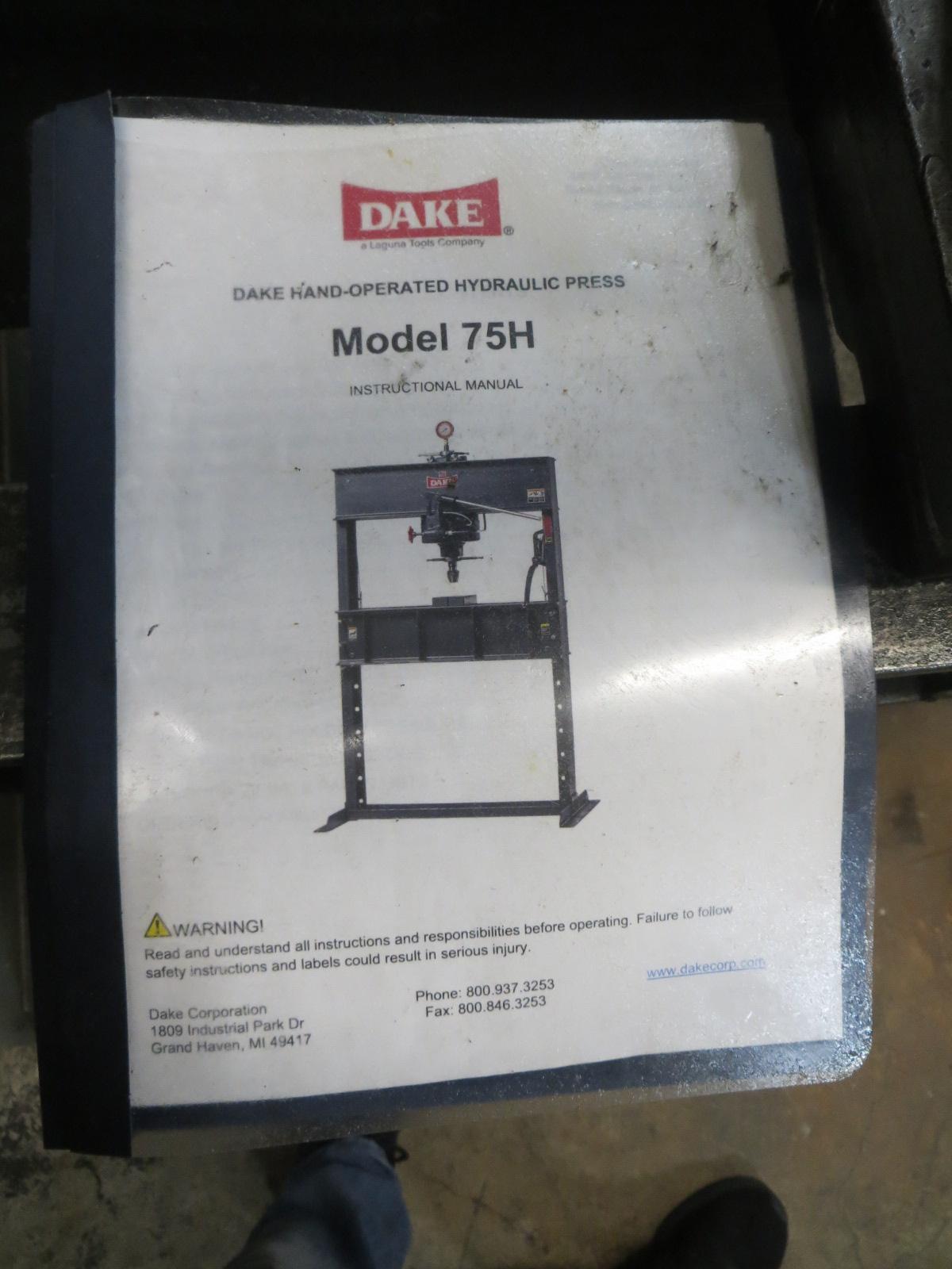 Lot 24: Dake 75H Hand Operated Hydraulic H-Frame Shop Press, 75 Ton,