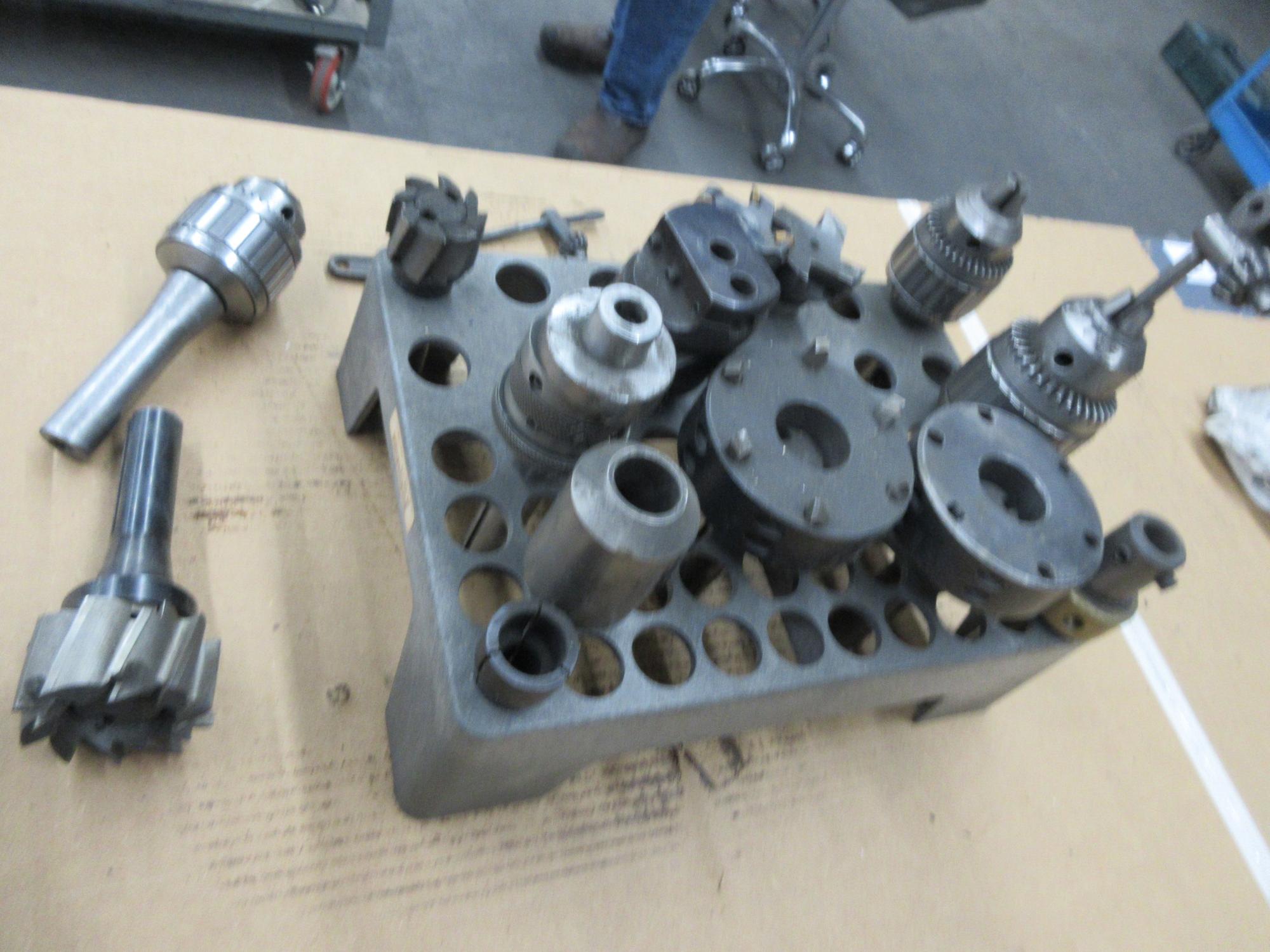 Lot 137: R8 Tooling in Rack, Assorted Size Jacobs Drill Chucks, Boring Heads, Shell Mills