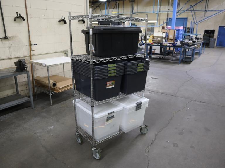 Lot 359: Uline Wire Rack Cart with 4 Shelves and Plastic Totes