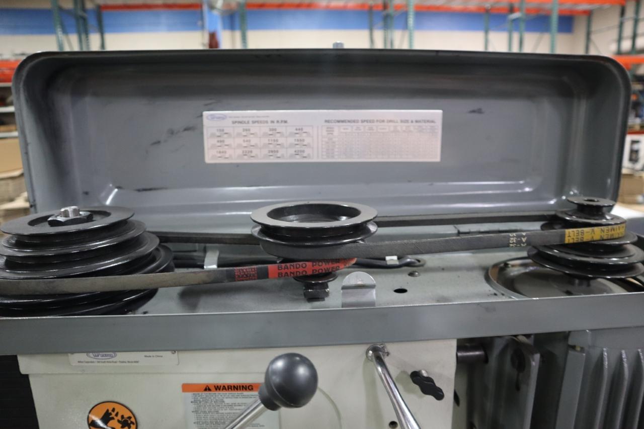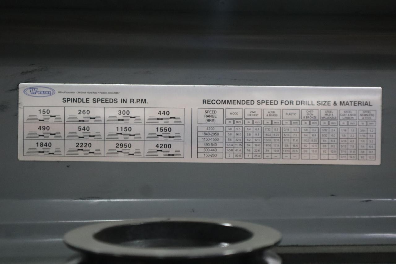 Equipped With: 10" Throat, 5/8" Drill CHuck, 12 Speeds 150-4,200 RPM, 16" x 14" Adjustable Height Table (Tilting) w Oil Gutters, Machined Base, 1.5 HP