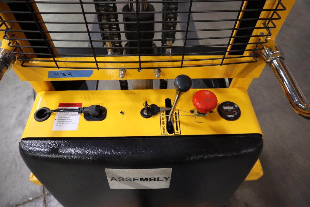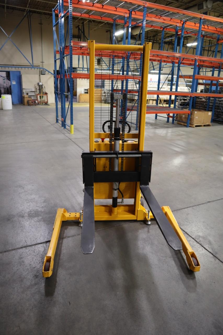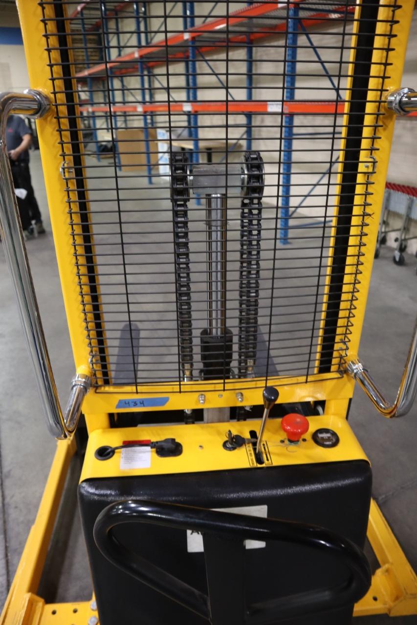 Lot 417: Uline H-5439 Electric Straddle Stacker Lift, 2,200# Cap, 63" Max Height, 50" Between Outriggers, 12 Volt Battery with Charger, 42" Forks