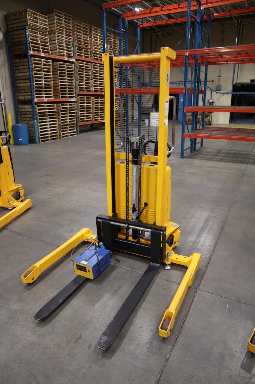 Lot 429: Uline H-5439 Electric Straddle Stacker Lift, 2,200# Cap, 63" Max Height, 50" Between Outriggers, 12 Volt Battery with Charger, 42" Forks