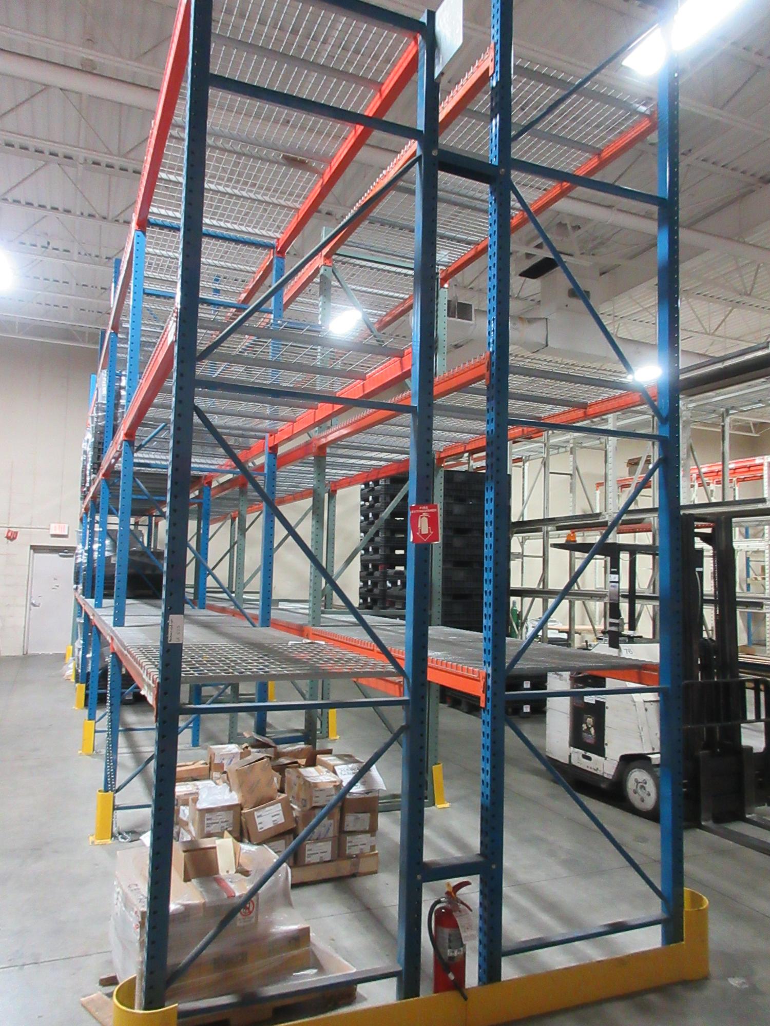 Lot 523: Pallet Racking Back to Back, Tear Drop Style (12) 14'x42" Uprights, (30) 8' Shelves with Wire Decking, *No Contents*