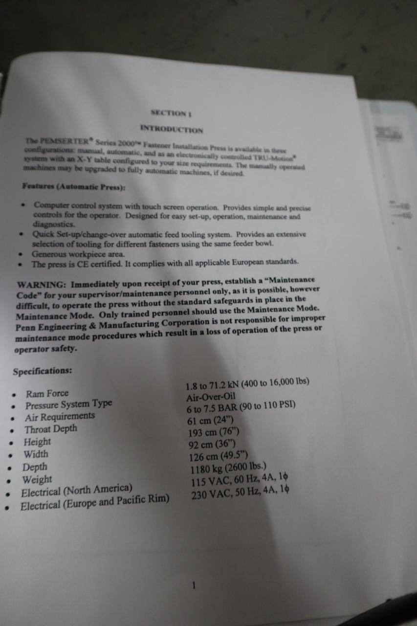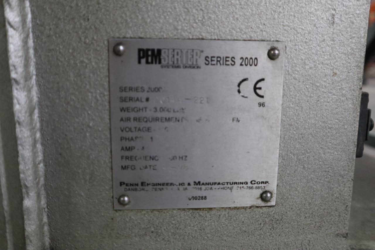 Lot 416: PEM Series 2000 Fastener Installation Press, 8 Ton Max Force, 24" Throat, Touch Screen Control, Vibratory Feeder Bowl
