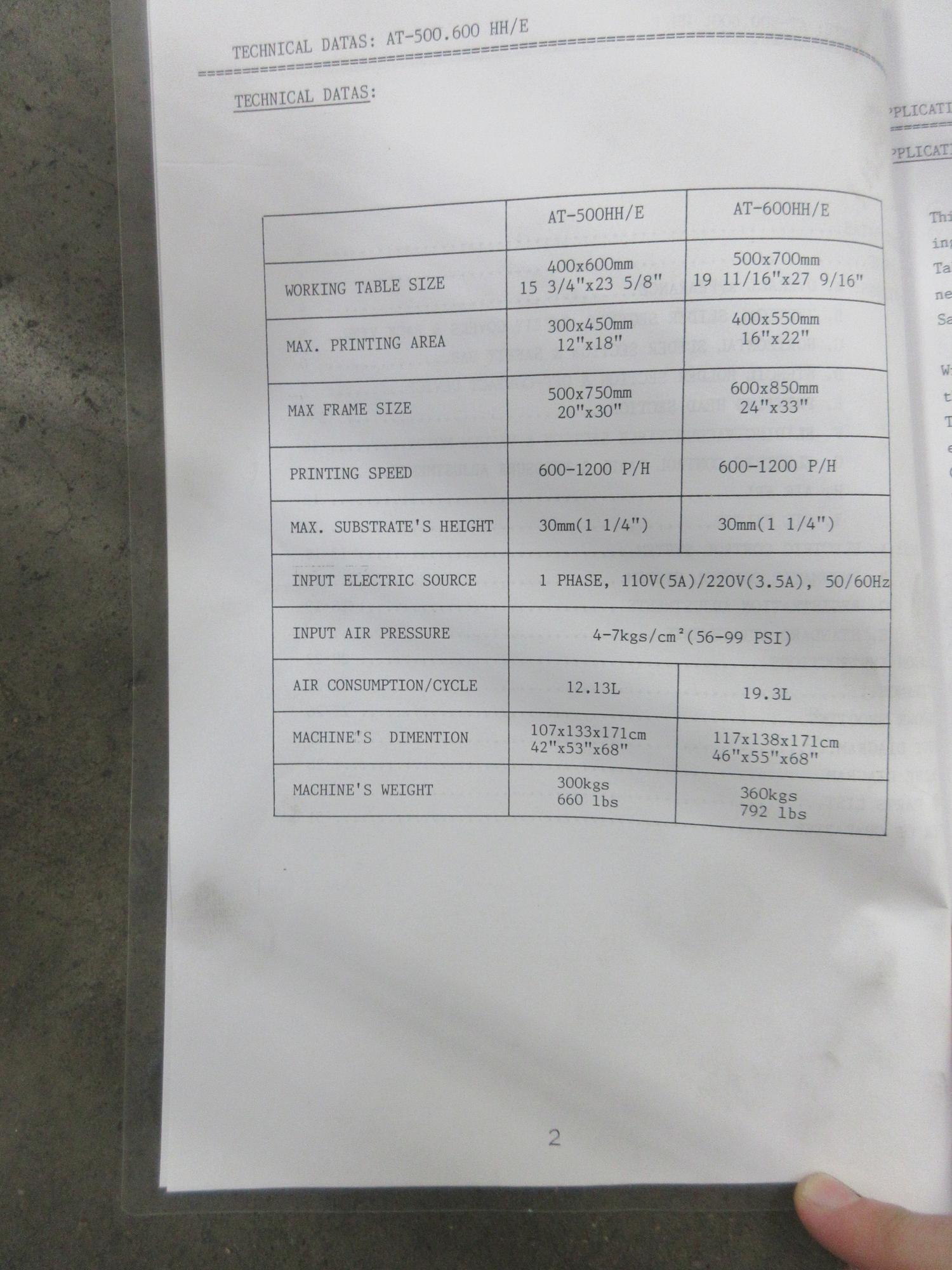 Equipped With: Pneumatic Squeegee, Working Table Size 19-11/16" x 27-9/16", Printing Speed 600-1200 P/H, Remote Foot Trip, Tool Box and Manual