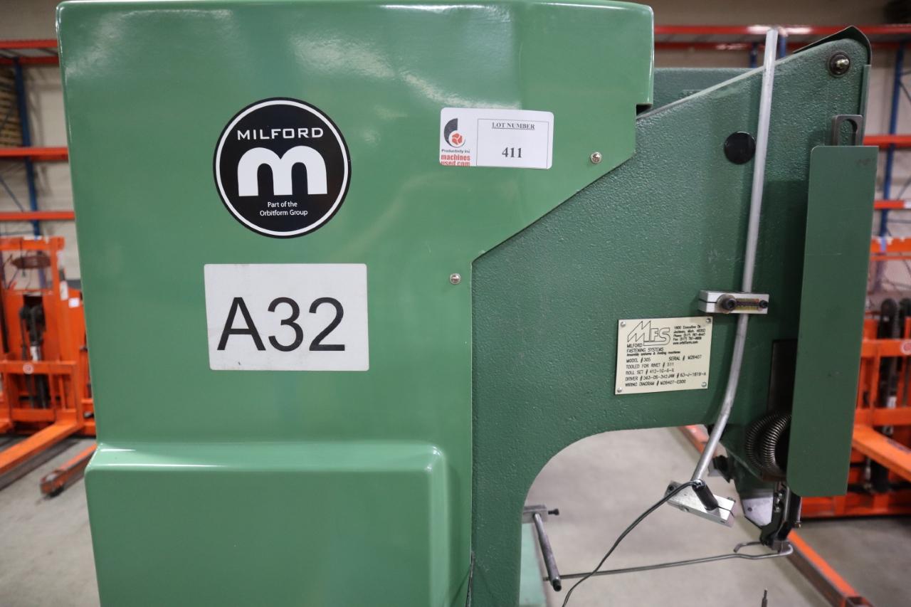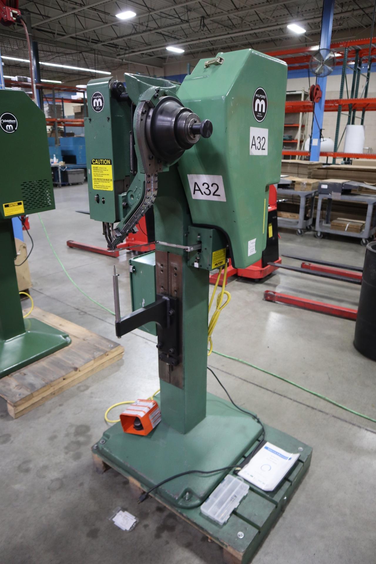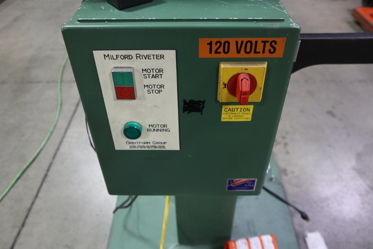 Lot 411: Milford Orbitform #305 Riveter, Remote Foot Trip, Feed Bowl and Track, Tooling