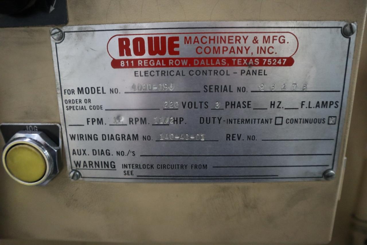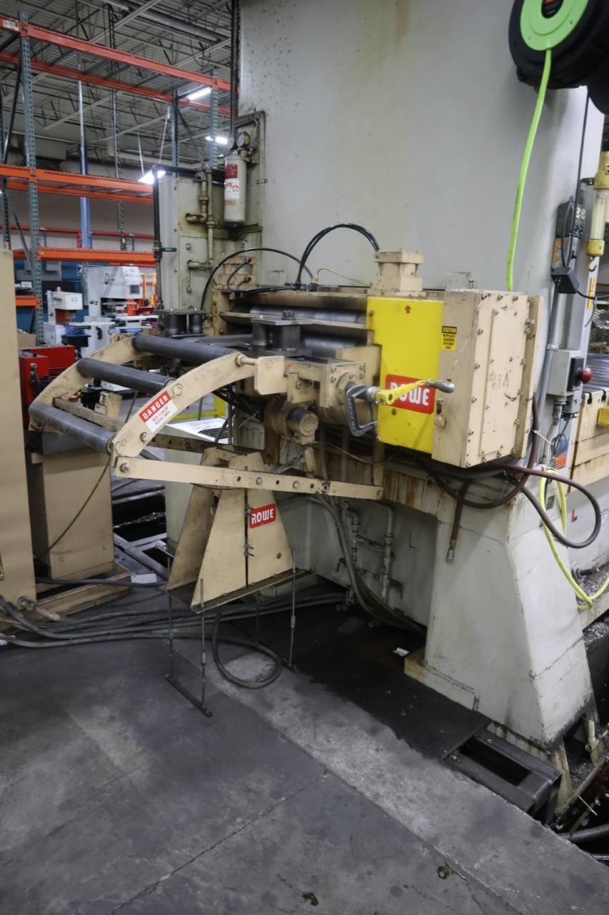 12" Stroke, 44" Shut Height, 12" Ram Adjustment, Variable Speed 20-40 SPM, 37" Windows, 96" x 54" Bed Bolster and Ram, 26" x 60" Ram Bolster, Die Cushion (2) UCC-24-22-6, SafeLite Curtains, Toledo Sequencer Tonnage Meter, Napco Mark VII Controls, Press Control Station, WITH: Rowe Press Feed System, Including: Rowe FDC-053-230 Press Feed (Serial: 26481) .020 - .074" Thickness Capacity x 30" Wide Capacity, Rowe PLC II Controls, Rowe PM-FDC-053-230 Control Panel, Rowe TTS-30, Rowe C3-30 30" Straightener (Serial 26479), Rowe 4030-DSJ Motorised Coil Reel (Serial: 26478) 4,000 Lb Capacity, 30" Max Coil Width, 60" Max Coil OD, Overarm, Peeler, Control and Operation Manuals, NOTE: Upper Porton of Press Rebuilt by Bliss and Pressline Industries in 2024